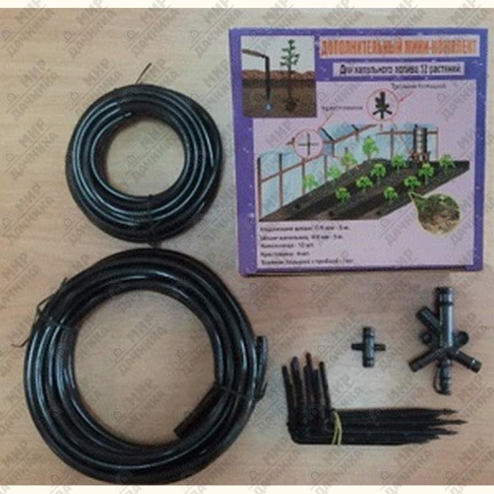 12 капельниц размещаются в прикорневой зоне растений или вдоль грядки. Между собой они попарно соединяются с помощью крестовины через шланги D=4/6 мм. Капельницы представляют собой колышки, обустроенные гребенкой, которая дозирует подачу воды. Установленную систему подсоединяют к подающему шлангу D=7/9 мм. Таким образом, любая установка с расширителем теперь сможет полить (60+12)=72 растения. Кроме этого, комплект может быть использован для ремонта всех видов системы капельного полива Aqua Planet.