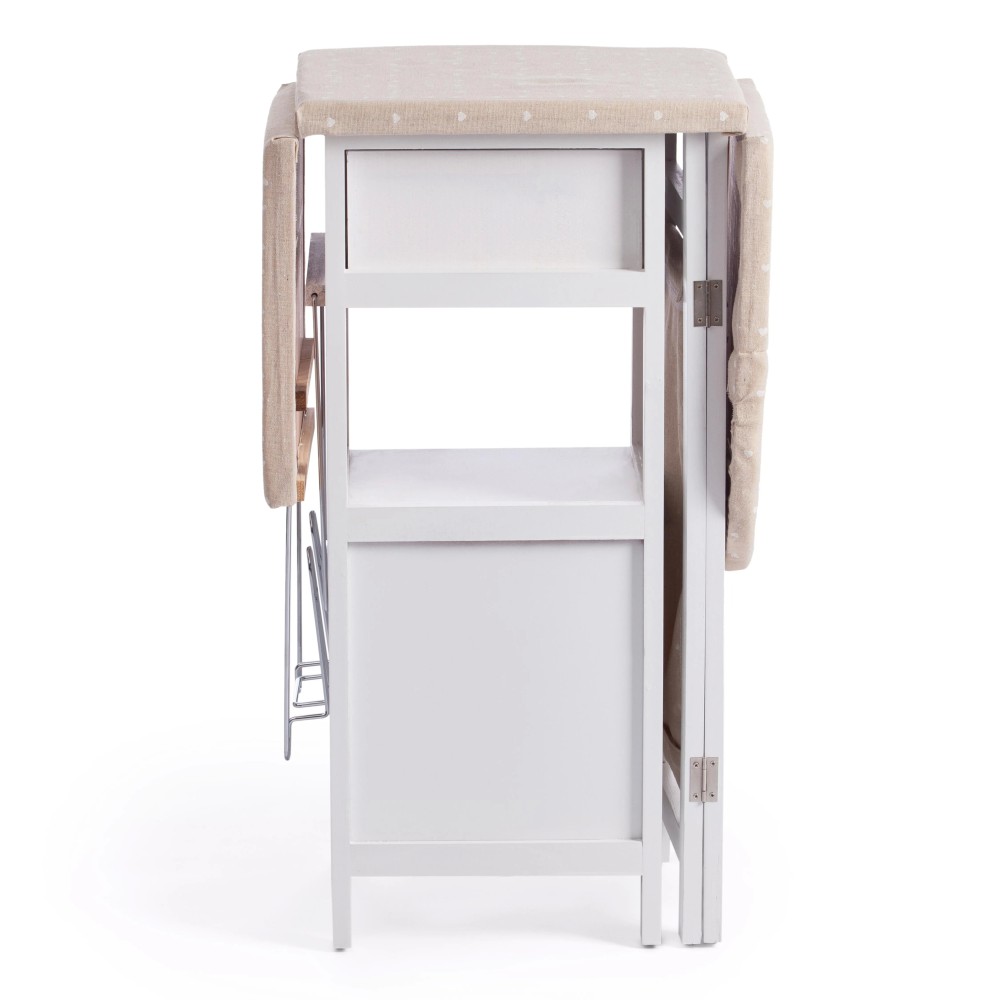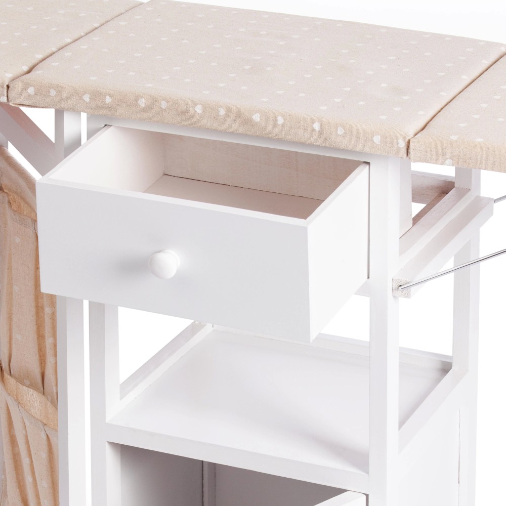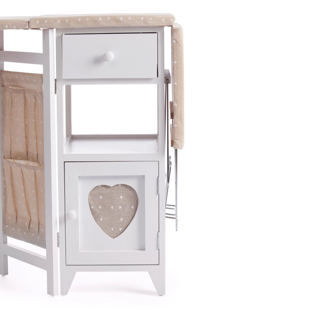 .Уют, нежность и красоту объединяет в себе гладильный комод Secret De Maison AMANT из коллекции SAINT-TROPEZ. Комод станет идеальным выбором для любой хозяйки. Его можно поставить в гостиной, спальне, коридоре, ванной. В сложенном виде он не занимает много места. Выдвижной ящик, отделение с дверцей и открытая полка станут отличной системой для хранения различных предметов. Благодаря наличию специального складного механизма, комод можно быстро и легко трансформировать в гладильную доску. Удобный размер доски, подставка для утюга и чехол из ткани обеспечивают оптимальные условия для глажки. Тканевые кармашки с нежным принтом добавляют естественности, мягкости и простоты изделию. Модель выполнена из массива павловнии. Это легкий и одновременно прочный материал, с хорошими водоотталкивающими свойствами, благодаря чему комод долговечен, надежен и не требует специального ухода. Изделие отлично сочетается с мебелью из коллекции SAINT-TROPEZ, поставляется в собранном виде.