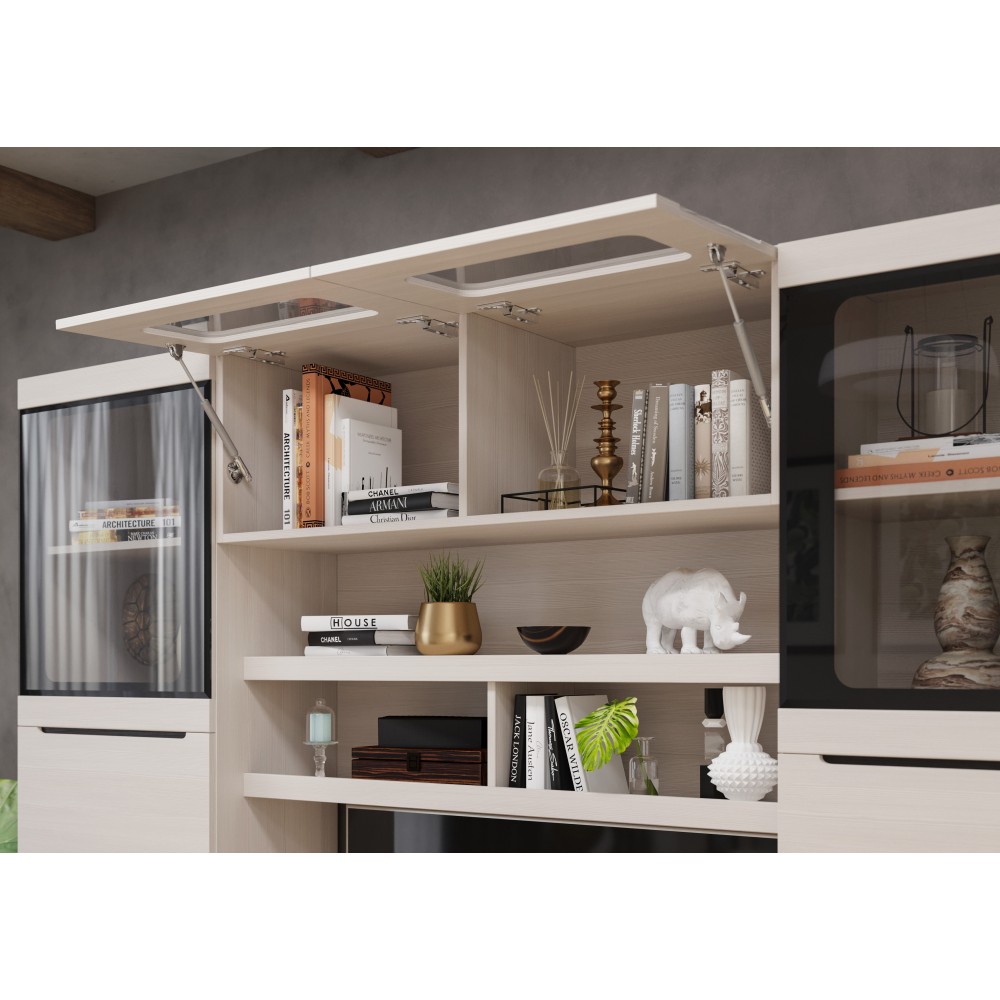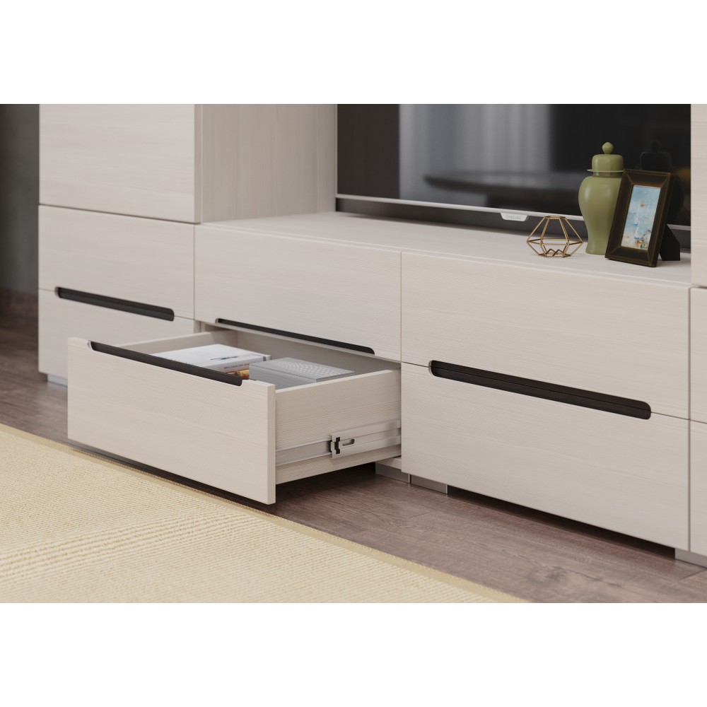Гостиная Эколь - современная модульная система для стильного и удобного интерьера. Шкафы предлагают максимальное наполнение и удобство сборки. Боковые части изделий делают интерьер эстетичным, а шариковые направляющие ящиков обеспечивают комфорт использования.