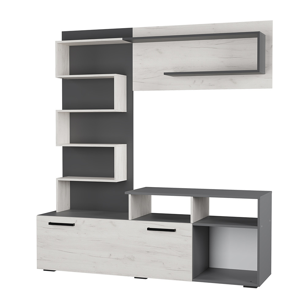 Компактные габариты гостиной "Евро" позволят без труда разместить ее практически в любом помещении. Оригинальный и эргономичный дизайн. Легкое открывание нижней секции благодаря механизму "газлифт". Удобное место под ТВ в сочетании с открытыми нижними полками для техники.