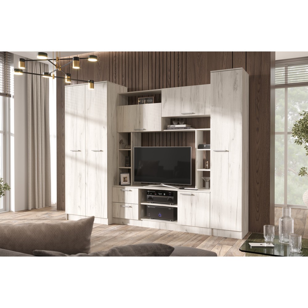 Она состоит из различных модулей, таких как полки, шкафы и место для телевизора.