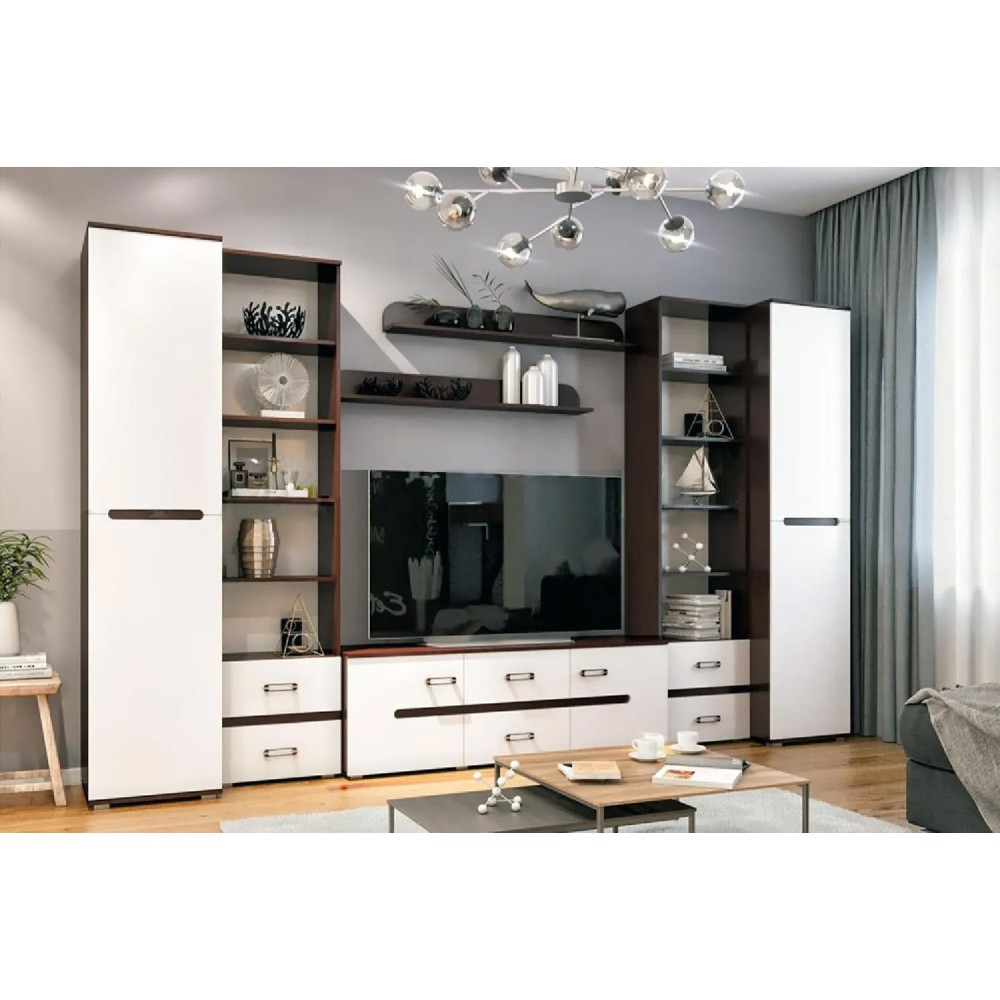 Гостиная Ким - современная модульная система для стильного и удобного интерьера. Шкафы предлагают максимальное наполнение и удобство сборки. Боковые части изделий делают интерьер эстетичным, а роликовые направляющие ящиков обеспечивают комфорт использования.