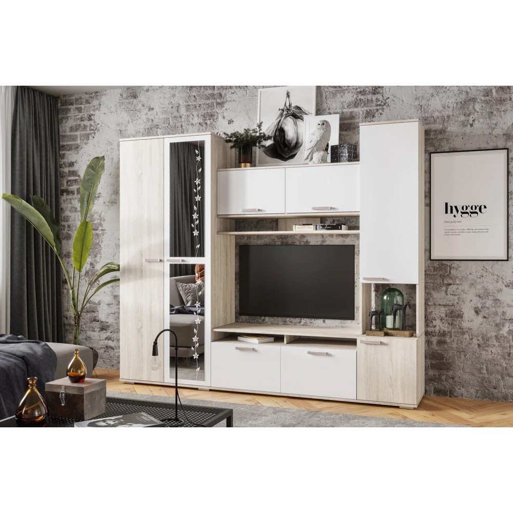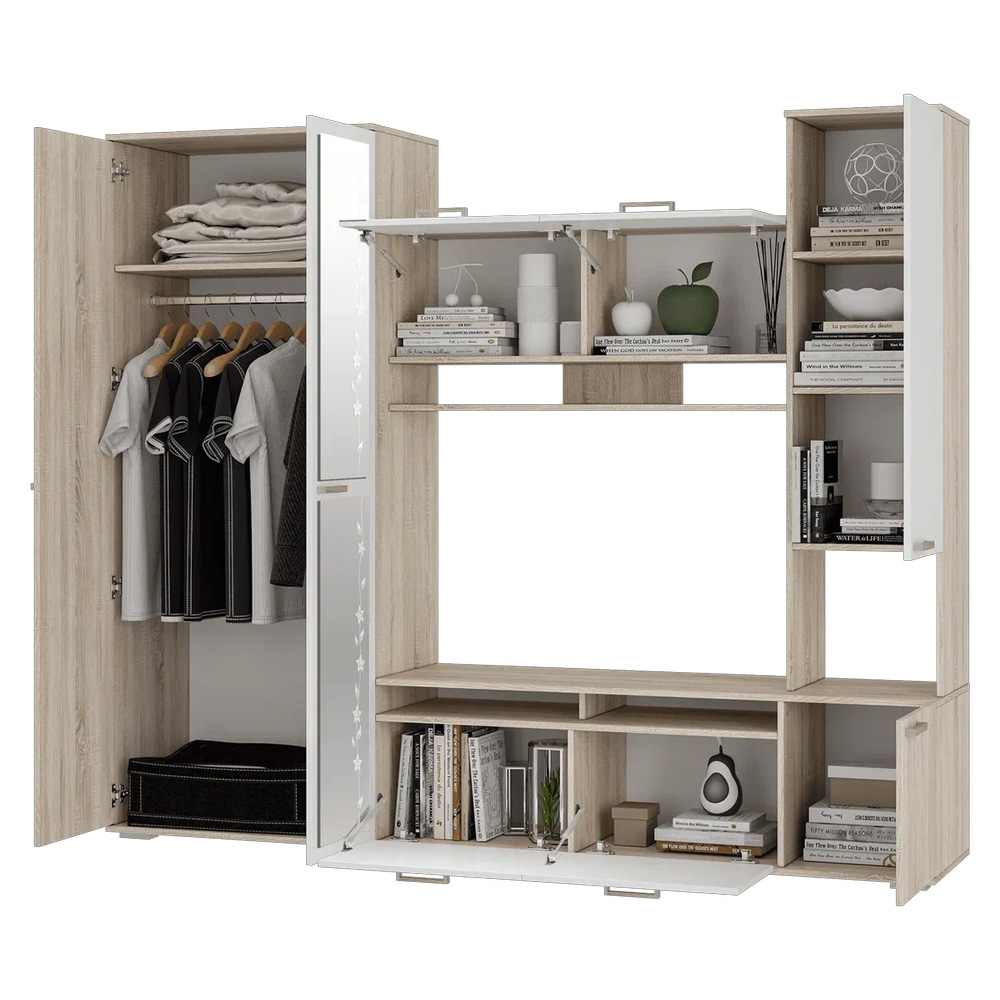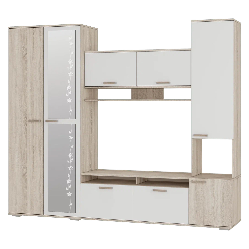 Компактный гарнитур «Лукас» – это функциональная стилизованная модель с простыми геометрическими формами и множеством полезного пространства. Контрастное сочетание фасадов белого цвета с древесной фактурой дуб сонома, а также отделка зеркалами станут ярким акцентом любого интерьера.