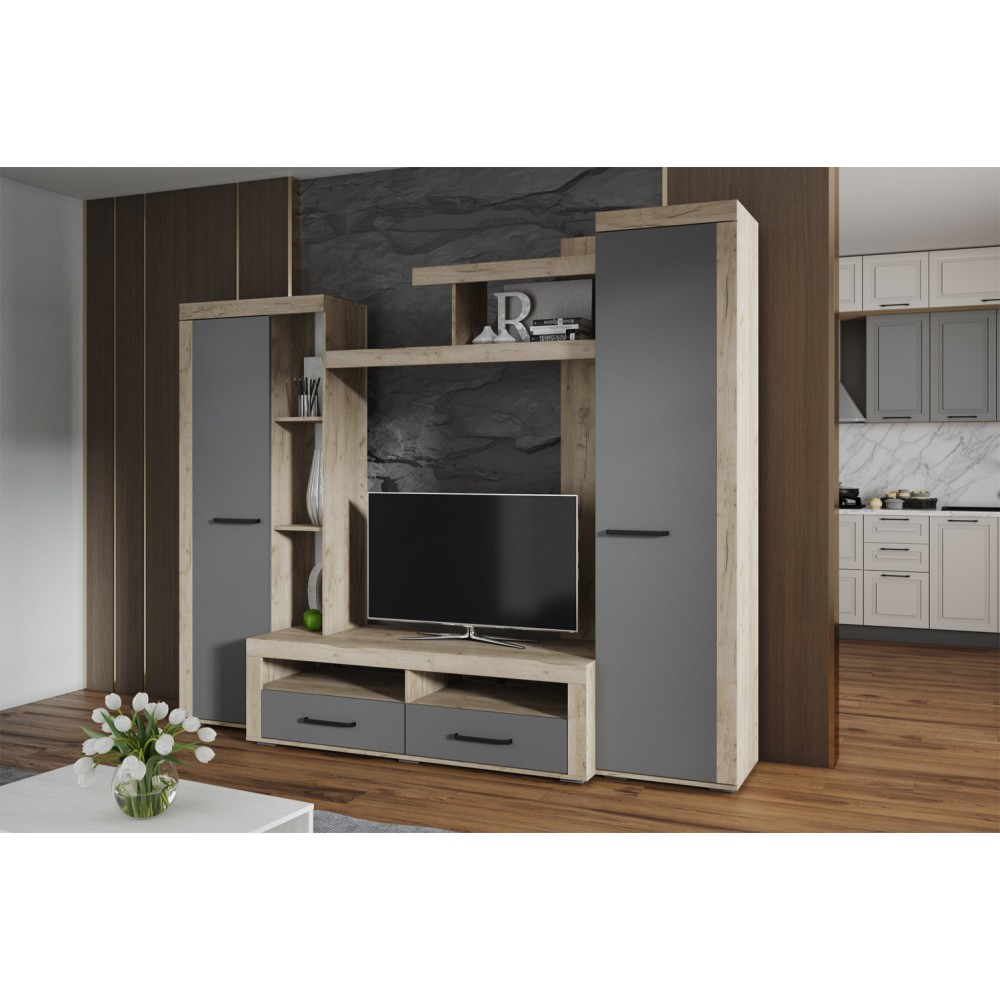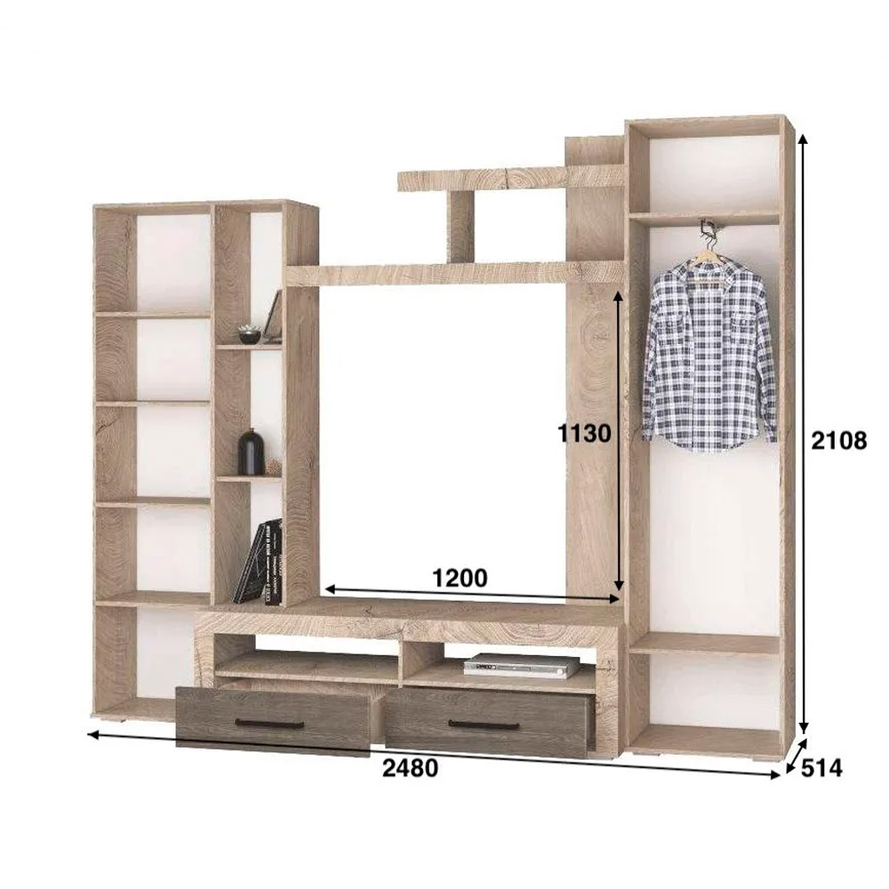 Модель оснащена вместительным шкафом для одежды, который помогает поддерживать порядок, а также удобной нишей под телевизор для размещения ТВ и другой техники. Конструкция продумана так, чтобы все необходимое было под рукой.
