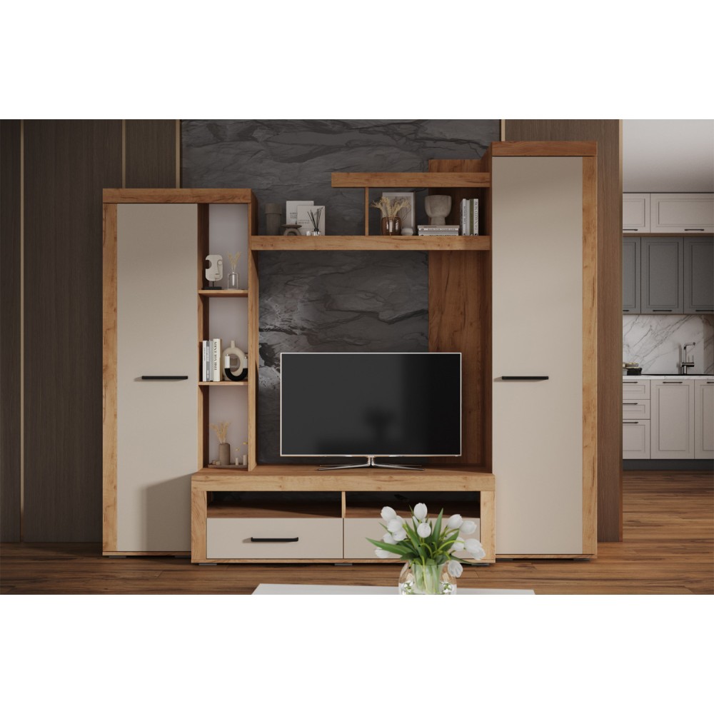 Модель оснащена вместительным шкафом для одежды, который помогает поддерживать порядок, а также удобной нишей под телевизор для размещения ТВ и другой техники. Конструкция продумана так, чтобы все необходимое было под рукой.