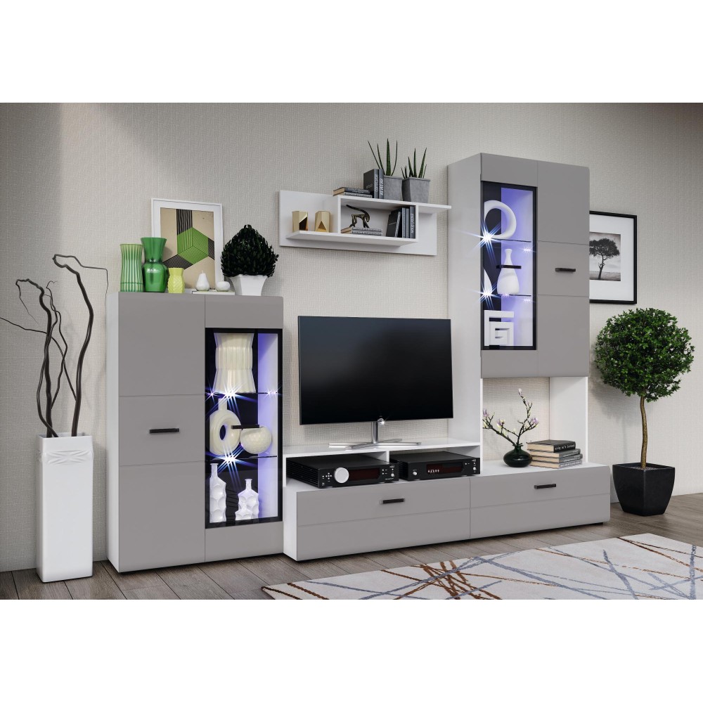 Изысканная, с приятным блеском гостиная, несомненно украсит собой любую квартиру или дом. В гостиной есть все необходимые элементы для красивого оформления комнаты. Фасады с фрезеровкой и стеклянные витрины создают современный и стильный образ вашему дому.