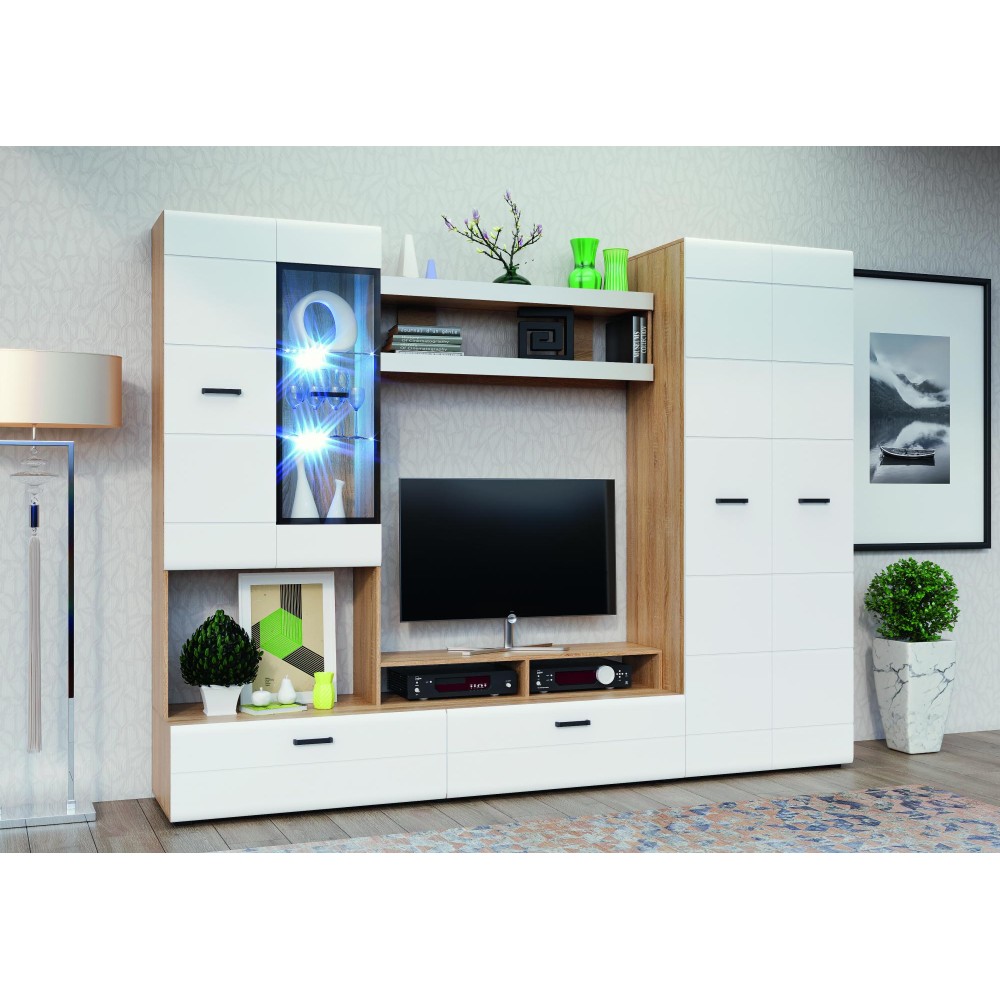 Гостиная Нэнси - современная модульная система для стильного и удобного интерьера. Шкафы предлагают максимальное наполнение и удобство сборки, а шариковые направляющие ящиков обеспечивают комфорт использования.
