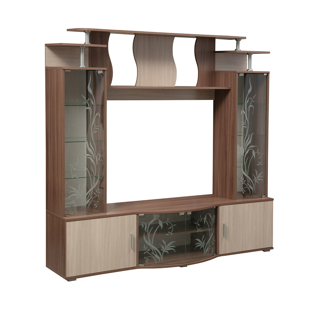 Она состоит из различных модулей, таких как полки, шкафы и место для телевизора.