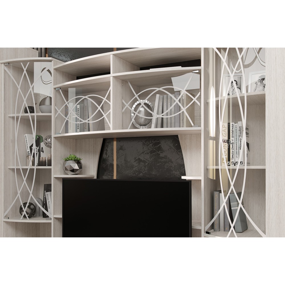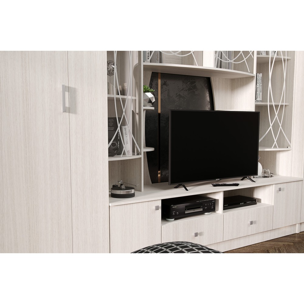 Она состоит из различных модулей, таких как полки, шкафы и место для телевизора.