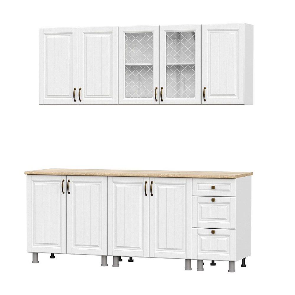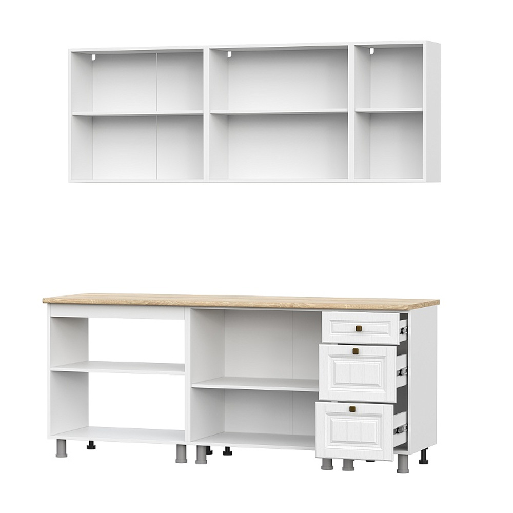 Готовая кухня Прованс - компактное и функциональное решение для вашего дома. Все фасады универсальные. Кухня комплектуется опорами, регулируемыми по высоте. Столешница, стеновая панель, а также дополнительное оборудование (мойка, смеситель, бытовая техника) приобретаются отдельно. Ручки в комплекте. Данная кухня доступна также в качестве модульной системы, что позволяет создать любую конфигурацию под размеры вашего помещения.