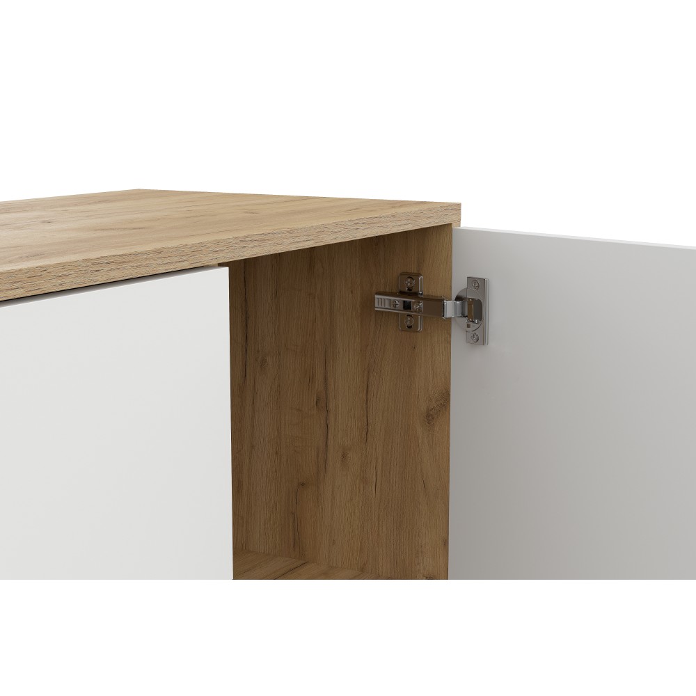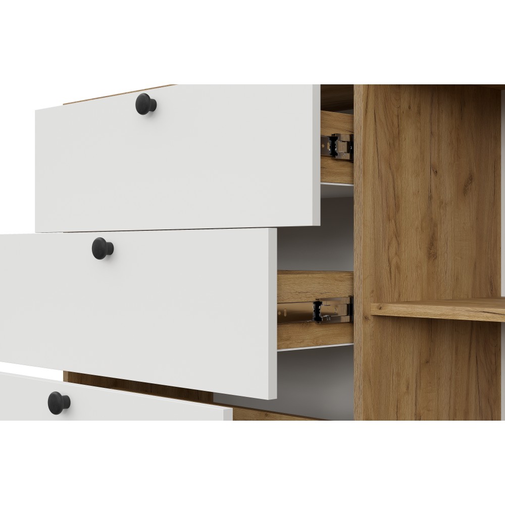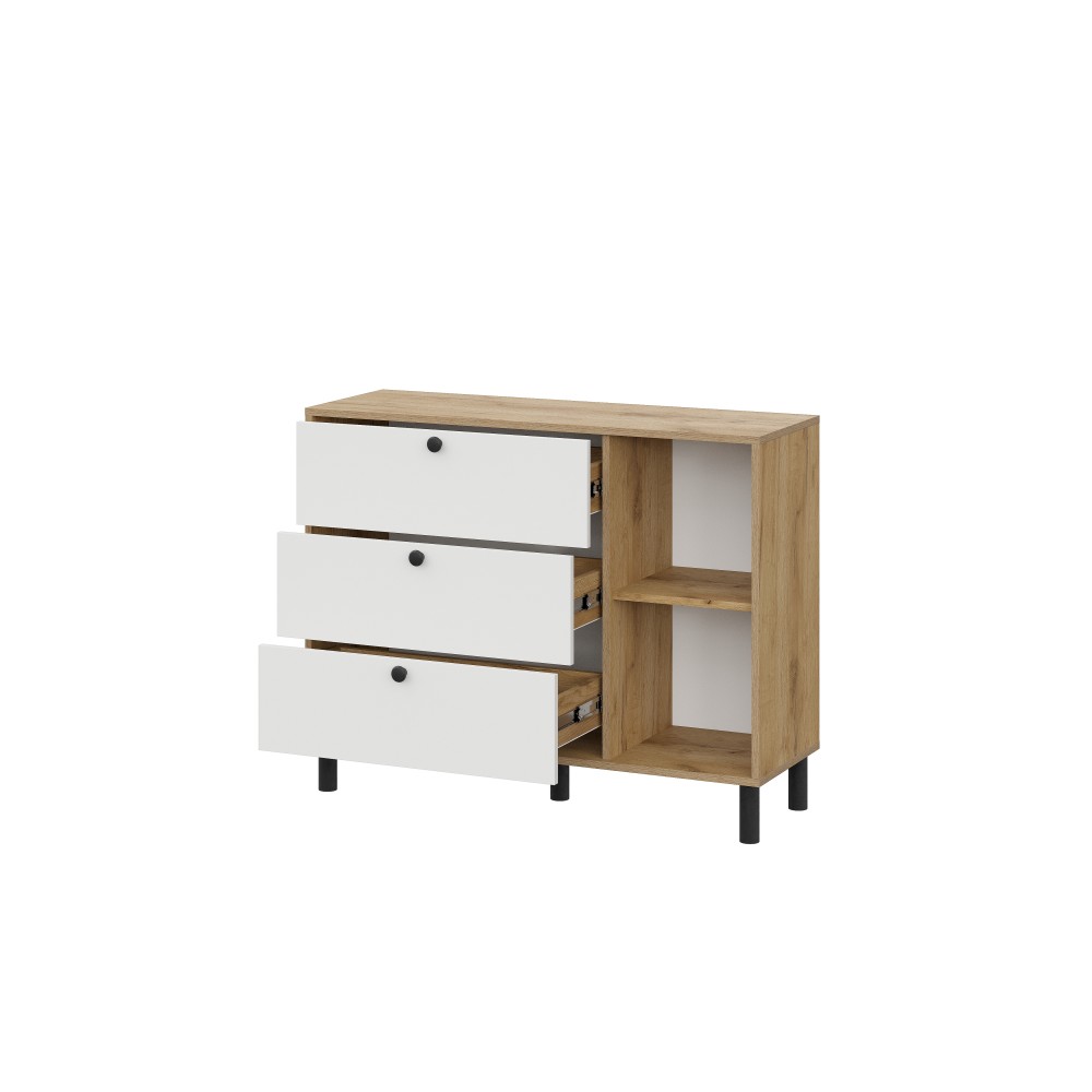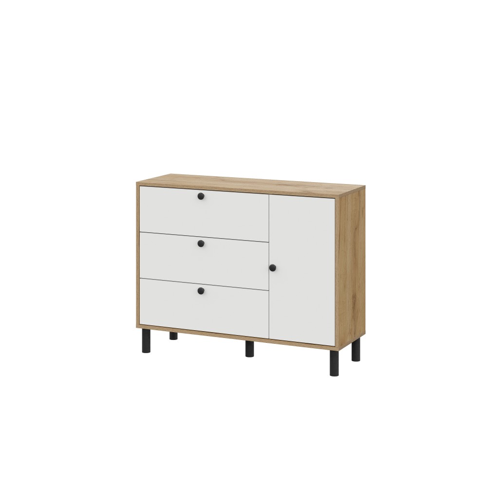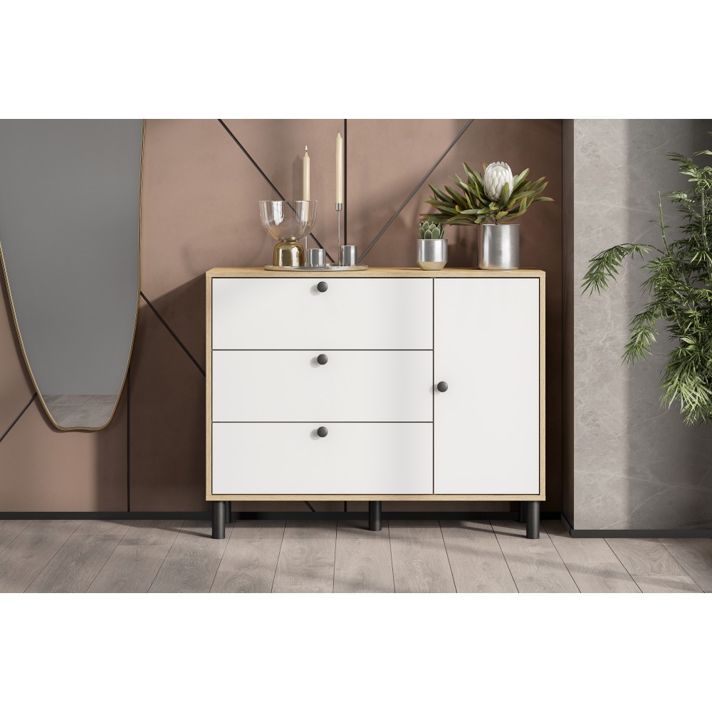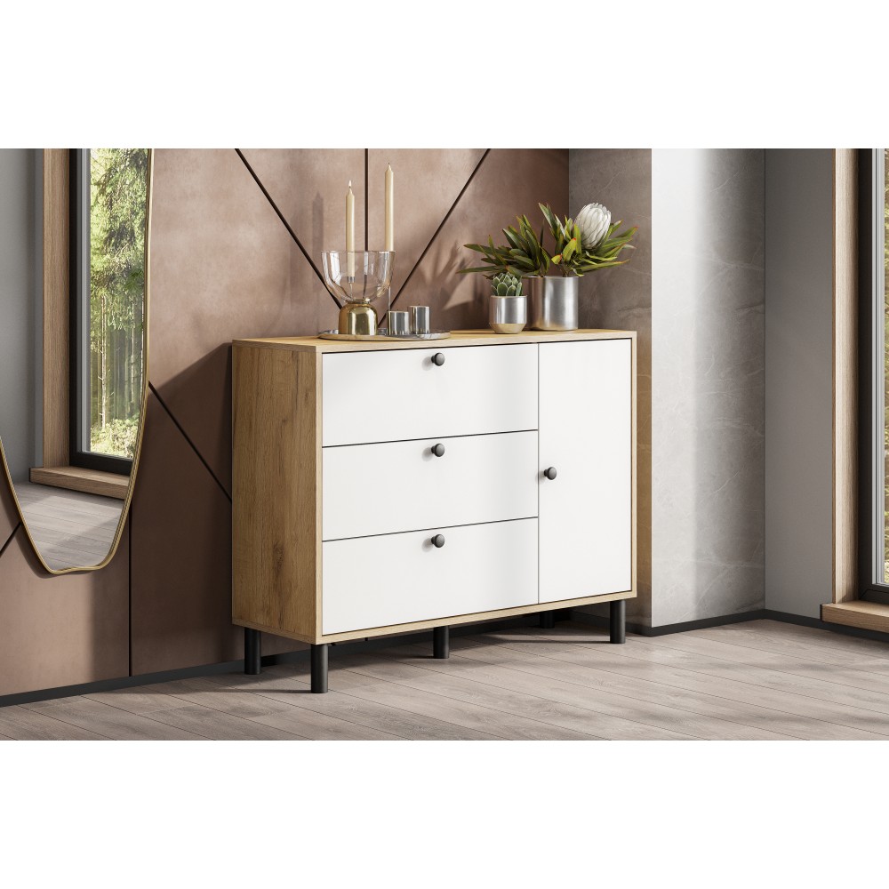 Комод КМ 25 дополнит современный интерьер комнаты. Вместительные ящики и полки за распашными дверьми позволят организовать место хранения белья и одежды, аксессуаров и других нужных предметов.
