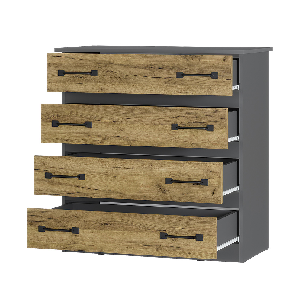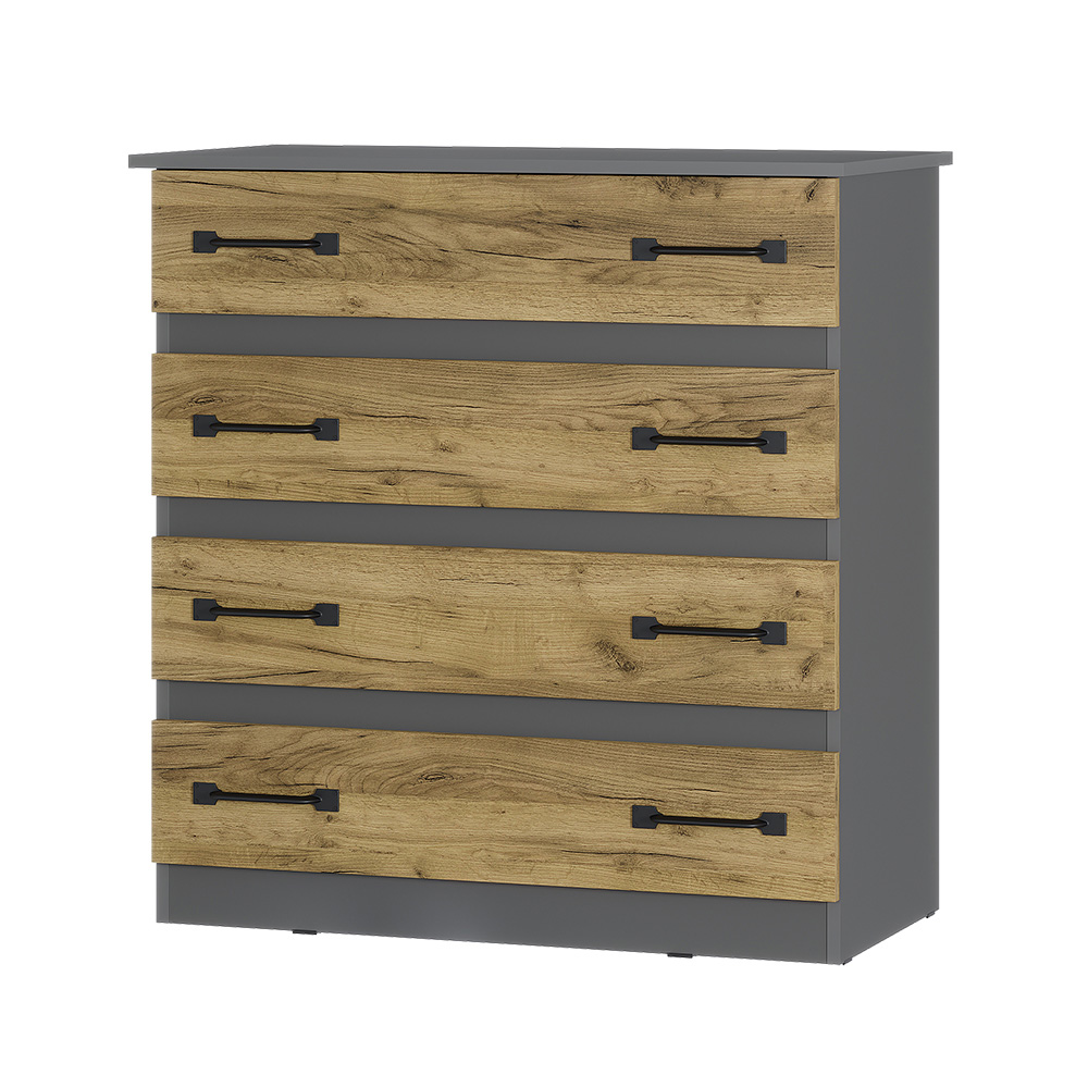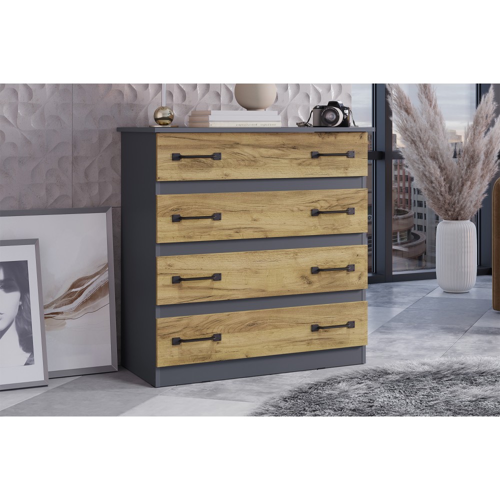 Комод «Лофт» — вместительный комод с четырьмя вместительными ящиками — универсальное решение, которое подойдёт и для спальни, и для домашнего кабинета, и для гостиной. Данная модель идеально подходит для хранения белья, одежды, аксессуаров, важных документов, украшений и мелочей. Верхнюю крышку можно использовать как дополнительную полочку для лампы.