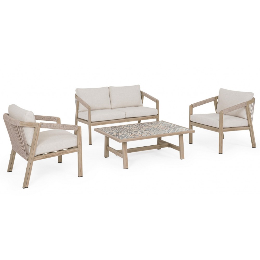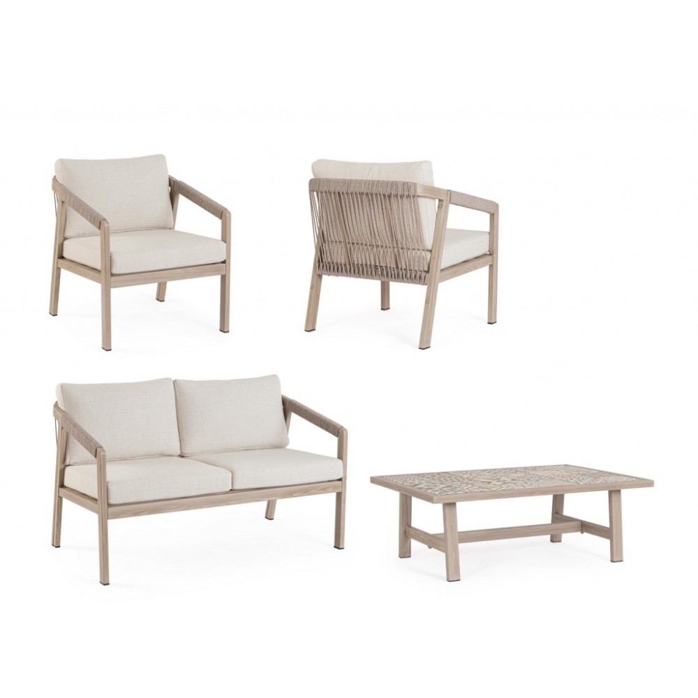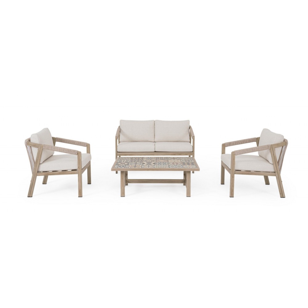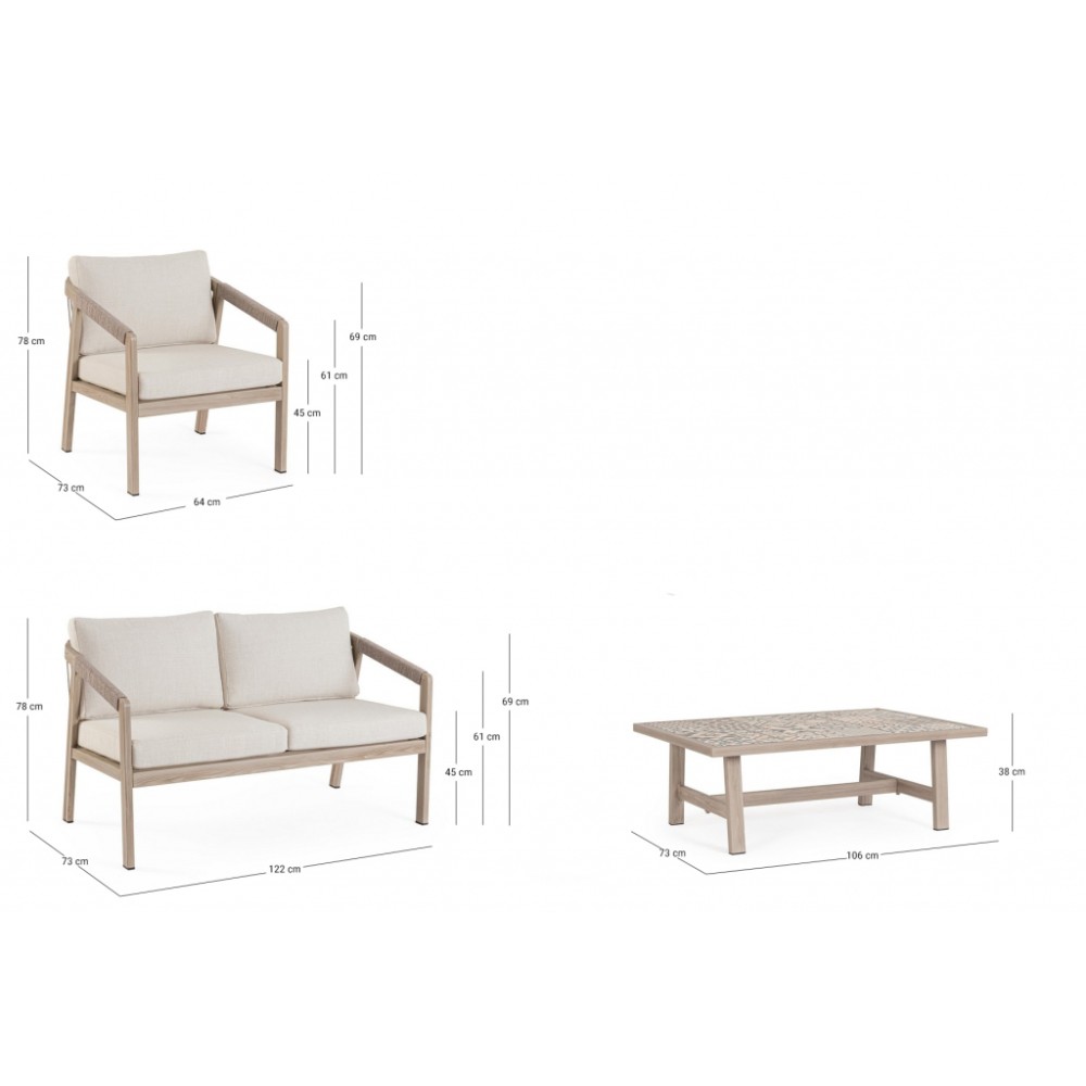 Минимальный заказ данной модели 1 шт. Данное изделие предназначено только для домашнего использования. Лаунж комплект мебели Kalimera- это современное и функциональное решение для создания уютной зоны отдыха на террасе, в саду или на патио. Дизайн сочетает в себе натуральные оттенки и современные формы, идеально вписывающиеся в любое пространство. Особенности: Каркас мебели выполнен из алюминия с порошковым покрытием (полиэстер) с отделкой под дерево. Плетение выполнено из роупа (полиэстер) Ø5 мм. Съемные чехлы подушек выполнены из олефиновой ткани (100% полипропилен). Высота сиденья: 450 мм, высота подлокотников: 610 мм, высота спинки без подушки: 690 мм. Столешница стола выполнена из глазурованной керамической плитки (Испания). Винты из нержавеющей стали. Изделие подлежит сборке. Состав комплекта: Двухместный диван с подушками, размер: 1220х730х780 мм - 1 шт. Кресло с подушками, размер: 640х730х780 мм - 1 шт. Журнальный столик, размер: 1060х730х380 мм - 1 шт. Открыть инструкцию по использованию и уходу.