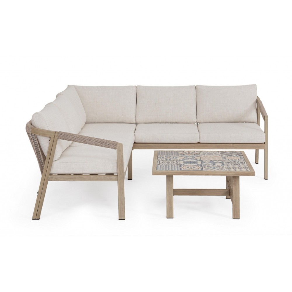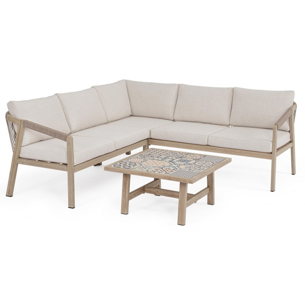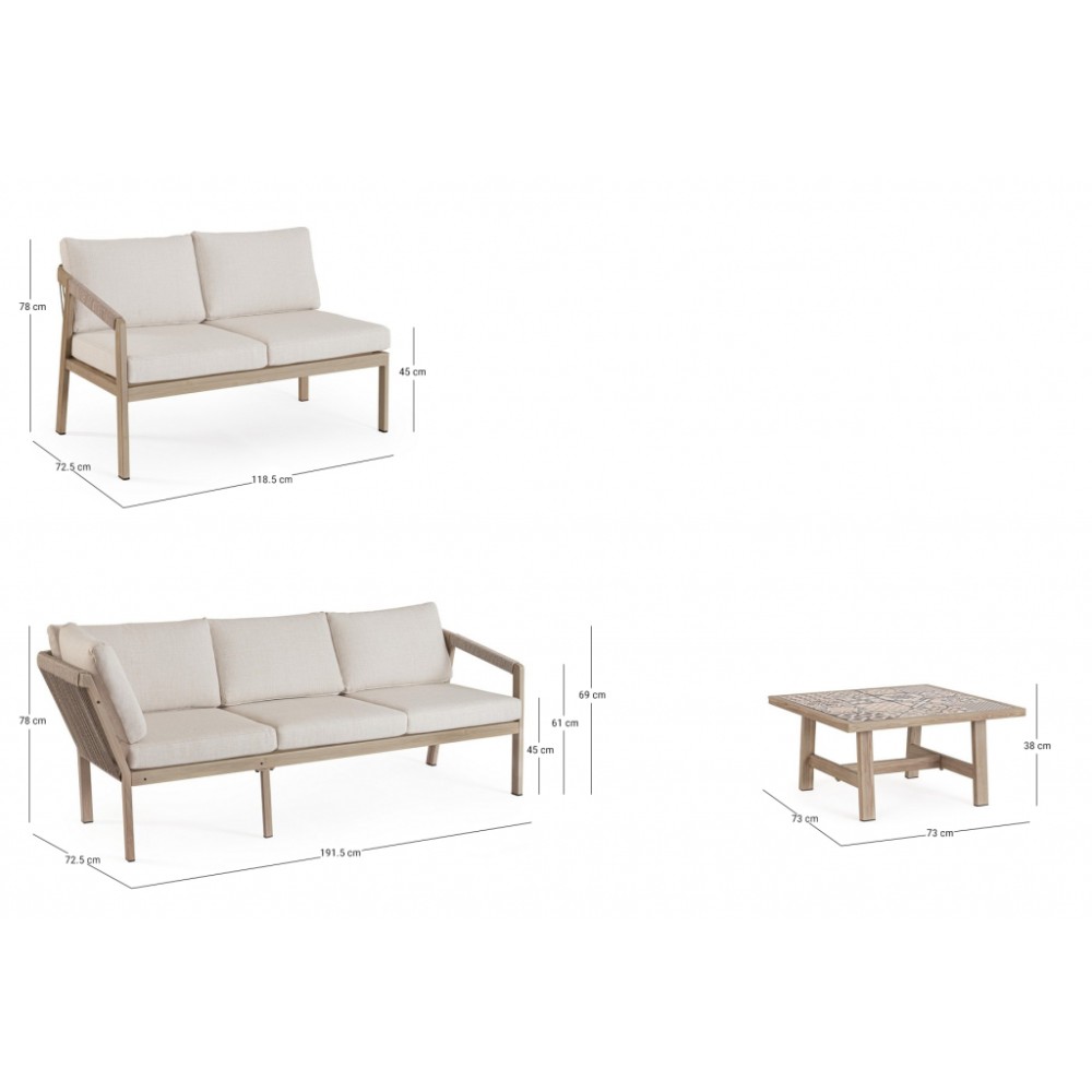 Минимальный заказ данной модели 1 шт. Данное изделие предназначено только для домашнего использования. Угловой лаунж комплект мебели Kalimera- это современное и функциональное решение для создания уютной зоны отдыха на террасе, в саду или на патио. Дизайн сочетает в себе натуральные оттенки и современные формы, идеально вписывающиеся в любое пространство. Особенности: Каркас мебели выполнен из алюминия с порошковым покрытием (полиэстер) с отделкой под дерево. Плетение выполнено из роупа (полиэстер) Ø5 мм. Съемные чехлы подушек выполнены из олефиновой ткани (100% полипропилен). Высота сиденья: 450 мм, высота подлокотников: 610 мм, высота спинки без подушки: 690 мм. Столешница стола выполнена из глазурованной керамической плитки (Испания). Винты из нержавеющей стали. Изделие подлежит сборке. Состав комплекта: Двухместный диванс подушками, размер: 1185х725х780 мм - 1 шт. Трехместный диван с подушками, размер: 1915х725х780 мм - 1 шт. Журнальный столик, размер: 730х730х380 мм - 1 шт. Открыть инструкцию по использованию и уходу.