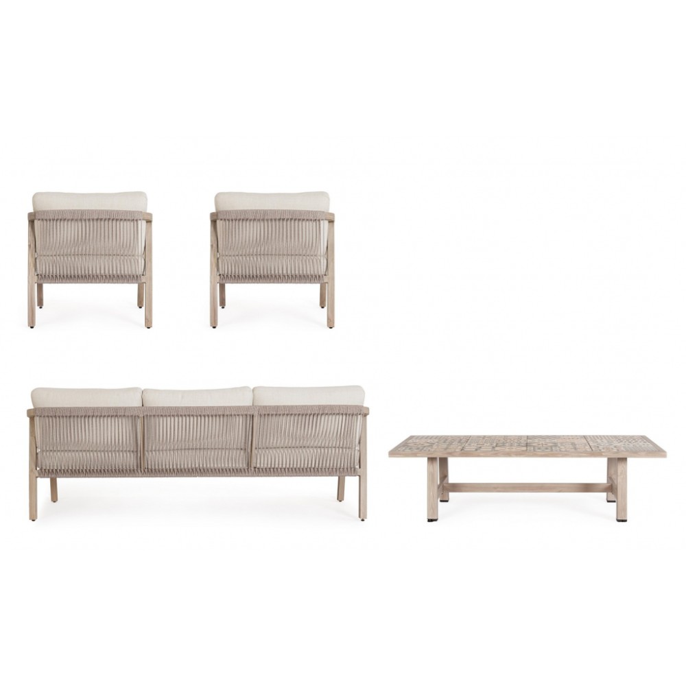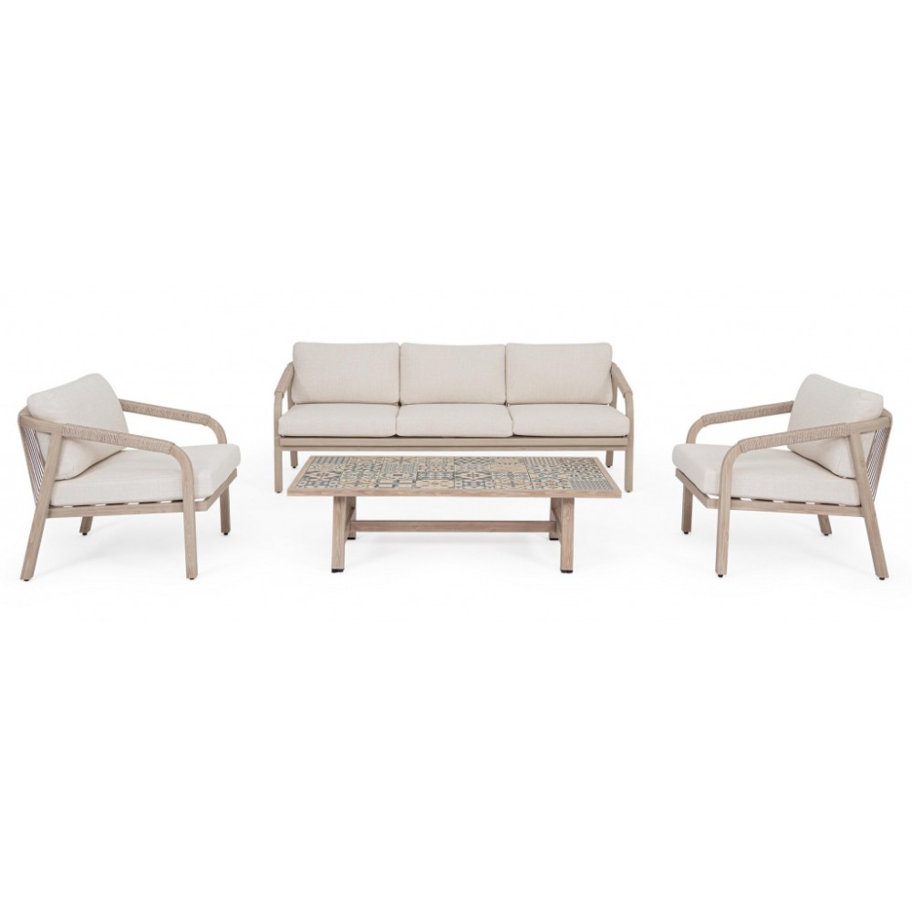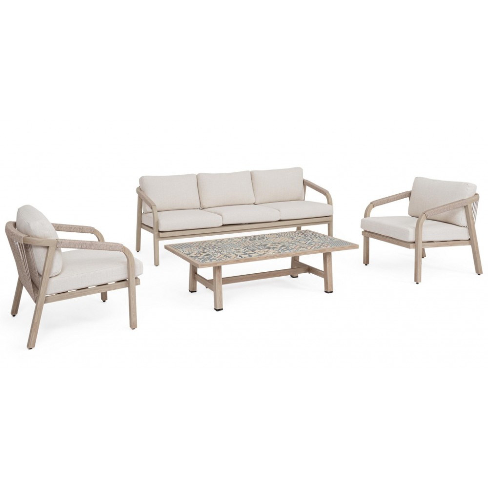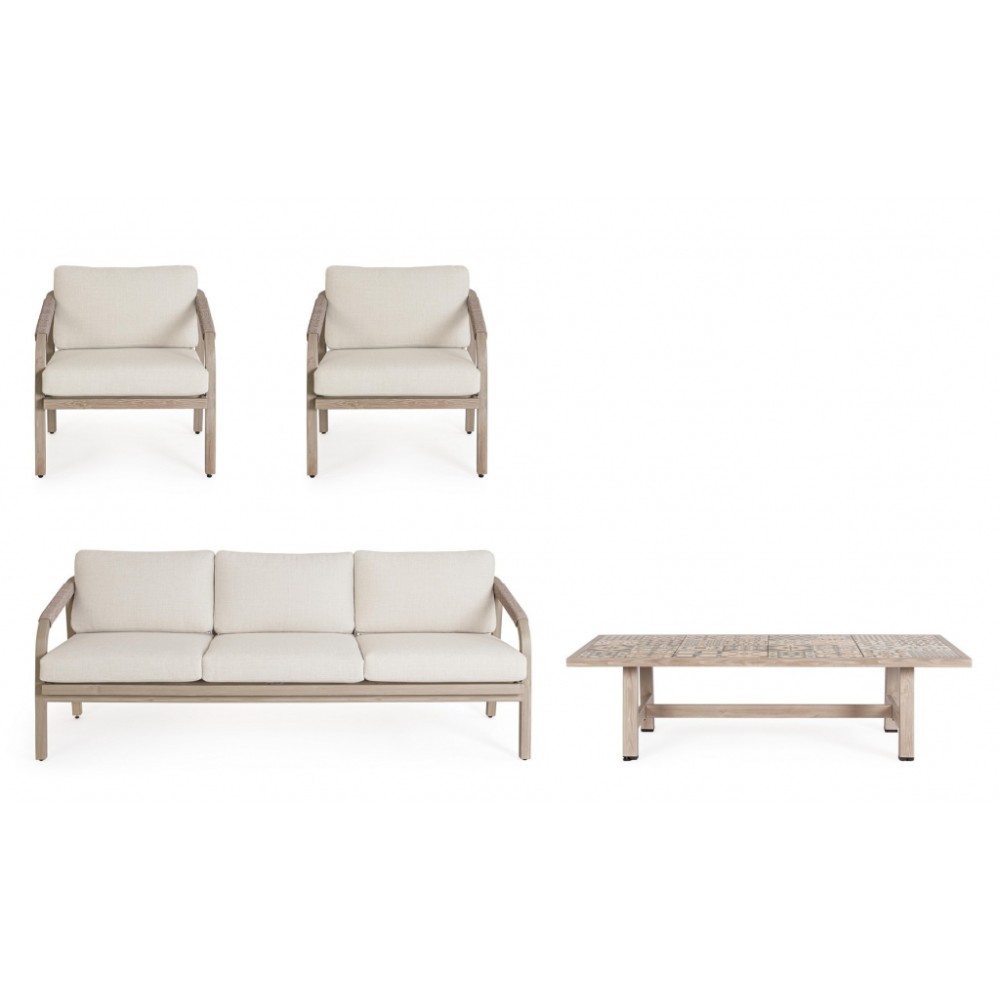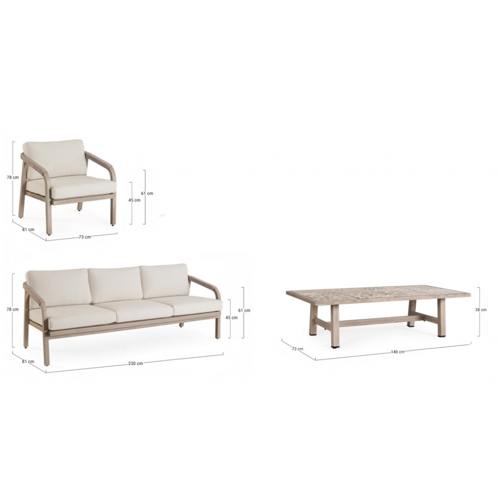 Минимальный заказ данной модели 1 шт. Данное изделие предназначено только для домашнего использования. Лаунж комплект мебели Kalimera- это современное и функциональное решение для создания уютной зоны отдыха на террасе, в саду или на патио. Дизайн сочетает в себе натуральные оттенки и современные формы, идеально вписывающиеся в любое пространство. Особенности: Каркас мебели выполнен из алюминия с порошковым покрытием (полиэстер) с отделкой под дерево. Плетение выполнено из роупа (полиэстер) Ø5 мм. Съемные чехлы подушек выполнены из олефиновой ткани (100% полипропилен). Высота сиденья: 450 мм, высота подлокотников: 610 мм, высота спинки без подушки: 690 мм. Столешница стола выполнена из глазурованной керамической плитки (Испания). Винты из нержавеющей стали. Изделие подлежит сборке. Состав комплекта: Трехместный диван с подушками, размер: 2030х810х780 мм - 1 шт. Кресло с подушками, размер: 730х810х780 мм - 1 шт. Журнальный столик, размер: 1400х730х380 мм - 1 шт. Открыть инструкцию по использованию и уходу.