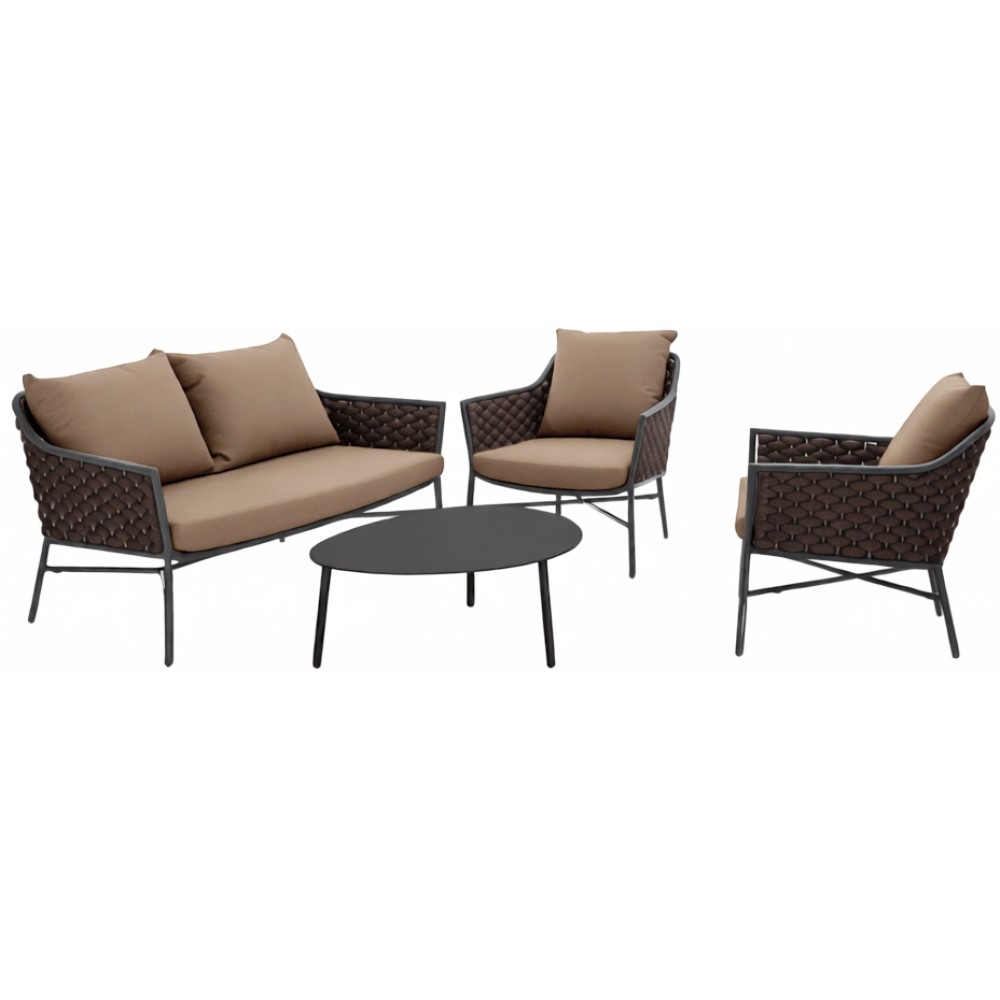 Данная продукция возится только под заказ с фабрики по предоплате. Комплект Panamaсостоит из двухместного дивана, двух кресел и журнального столика. Устойчивый и надежный каркас из алюминия кресел и дивана оплетен текстиленовым и резиновым канатом. Подушки из текстилена обеспечивают дополнительный комфорт. Журнальный столик выполнен из алюминия. Стильный и удобный комплект можно разместить в зоне отдыха в помещении или на открытом воздухе. Комплект лаунж мебели Panama - напоминание о расслабляющей атмосфере карибских пляжей с одной стороны, и невероятных морских волнах - с другой. Модель соединяет два мира: мир отдыха и релаксации с миром бодрствования и веселого настроения. Состав комплекта: Диван с подушками, размер: 1600х770х760 мм, высота сиденья: 400 мм, вес: 23кг - 1 шт. Кресло с подушками, размер: 730х770х760 мм, высота сиденья: 400 мм, вес: 18 кг - 2 шт. Журнальный стол Island, размер: 1000х700х340 мм, вес: 8 кг - 1 шт.