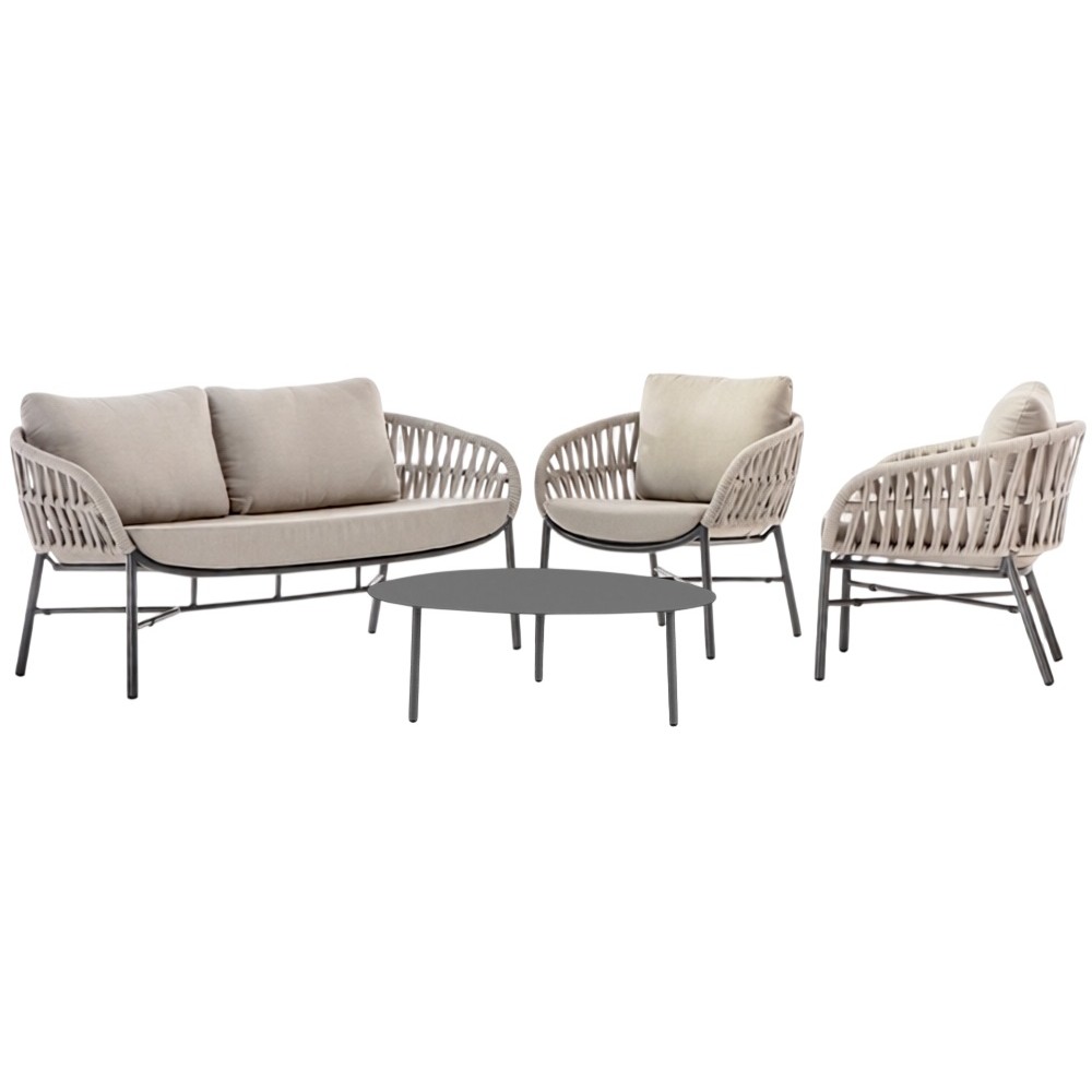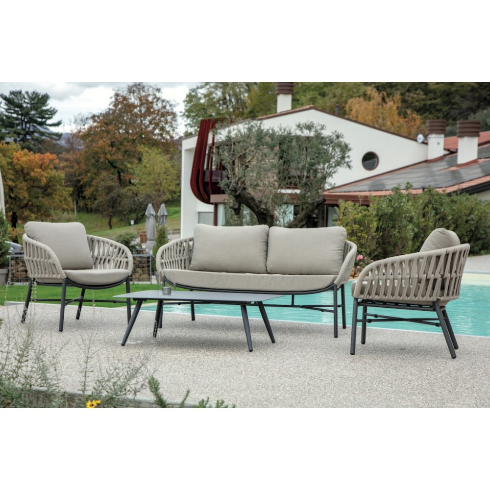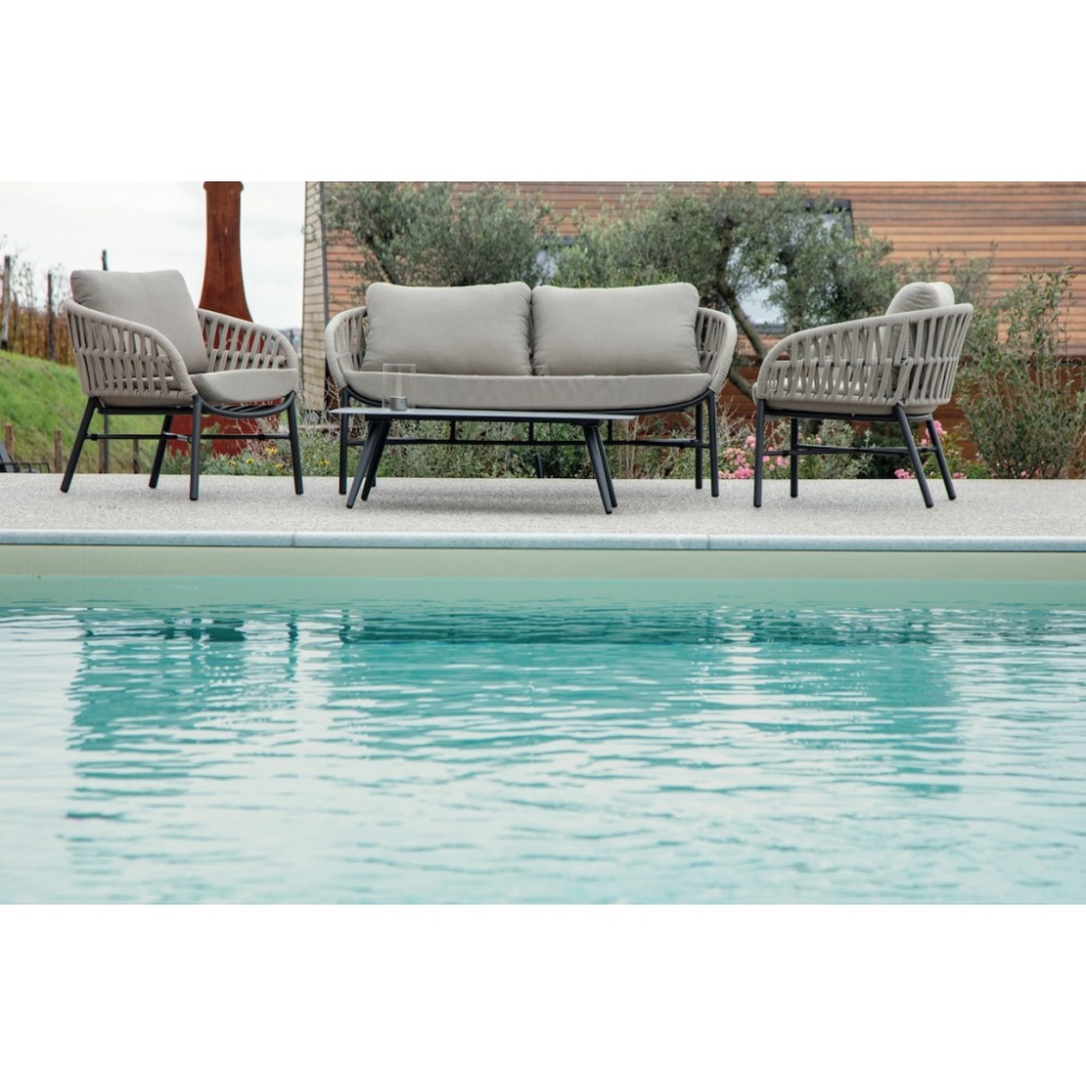 Данная продукция возится только под заказ с фабрики по предоплате. Tahiti - это современный садовый комплект, который создает открытую зону отдыха, подходящую для четырех человек, состоящий из двухместного дивана, двух кресел и журнального столика. Мебель имеет алюминиевый каркас с порошковым покрытием. Диван и кресла дополняются переплетением из каната из полиэстера толщиной 6 мми подушками на сиденье и спинке. Чехлы на подушкахвыполнены из олефина, устойчивогок воздействию ультрафиолетовых лучей и плесени. Журнальный столик Island Big выполнен из алюминия. Столешница -алюминиевый листтолщиной 5 мм. Состав комплекта: Диван с подушками, размер: 1600х770х750 мм, высота сиденья: 400 мм, вес: 23 кг - 1 шт. Кресло с подушками, размер: 770х770х750 мм, высота сиденья: 400 мм, вес: 18 кг - 2 шт. Журнальный стол Island Big, размер: 1100х700х350 мм, вес: 8 кг - 1 шт.