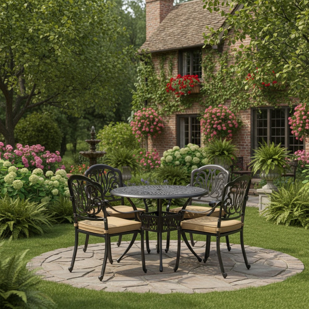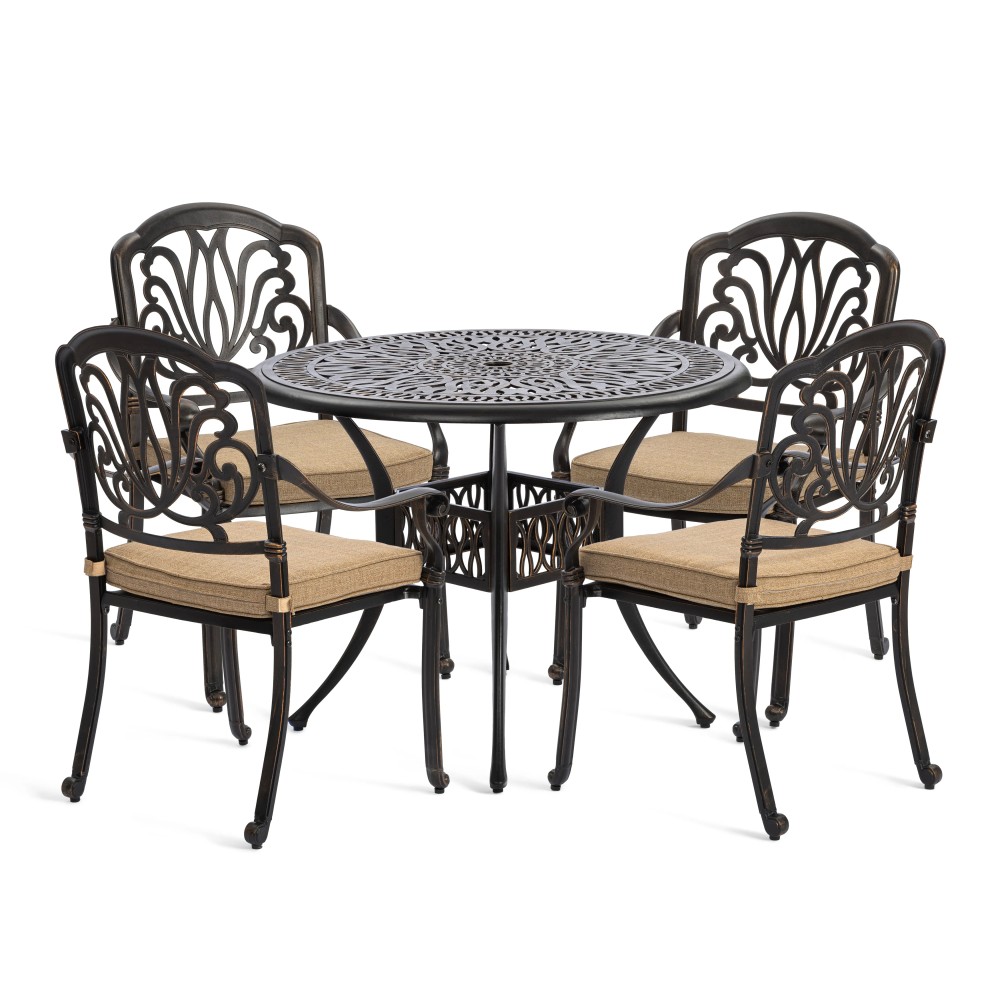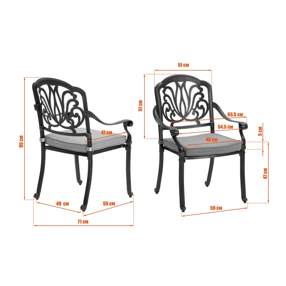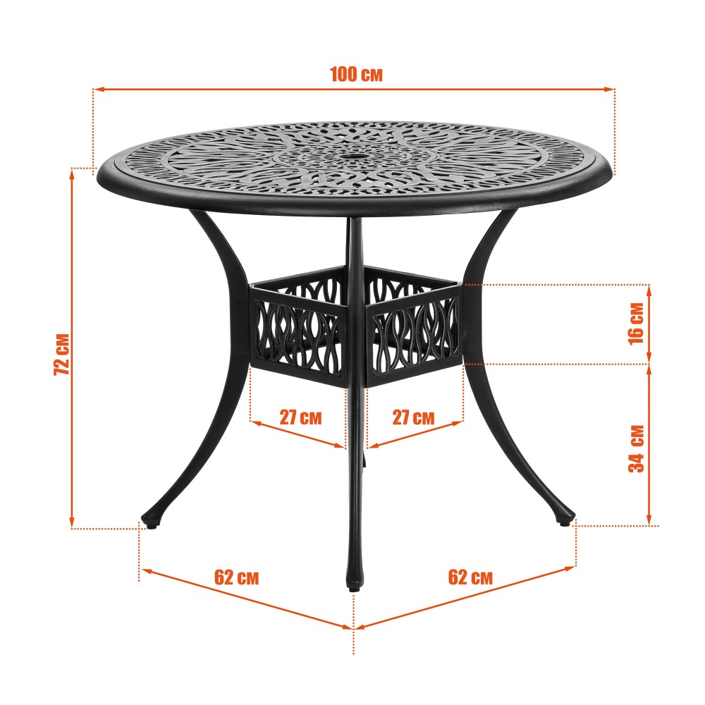 Представляем комплект кованой мебели Quartet/Квартет — идеальное решение для создания уютной и стильной зоны отдыха на даче, в саду, на террасе или в летнем кафе. Изящный ансамбль включает стол и четыре кресла с мягкими подушками, обеспечивая максимальный комфорт для всей семьи или компании гостей. Изысканные кованые узоры, выполненные с особым мастерством, придают комплекту неповторимый шарм и визуальную лёгкость. Декоративная художественная ковка гармонично вписывается в любой ландшафтный дизайн — от классического до прованского стиля. Каркас изготовлен из прочного стального сплава с защитным порошковым напылением, что гарантирует высокую устойчивость к коррозии, механическим нагрузкам и длительный срок службы. Четыре удобных кресла дополнены мягкими подушками. Подушки оснащены специальными креплениями на липучках, которые надежно фиксируют их на сиденьях и предотвращают смещение во время использования. При необходимости подушки легко снимаются для чистки или хранения. Стол отличается устойчивой конструкцией и функциональностью. В центре столешницы предусмотрено специальное отверстие для установки садового зонта, что позволяет создать комфортную тень в солнечную погоду. Такое решение делает комплект особенно практичным для использования на открытом воздухе. Комплект садовой мебели Quartet/Квартет устойчив к любым погодным условиям, выдерживает значительные нагрузки и не требует сложного ухода. Он надолго сохраняет презентабельный внешний вид даже при активной эксплуатации. Кованая мебель Quartet/Квартет — это гармоничное сочетание эстетики, надежности и комфорта. Отличный выбор для тех, кто ищет качественную и стильную садовую мебель для загородного дома или коммерческого пространства. Комплект поставляется в разобранном виде, что обеспечивает удобство транспортировки и сборки.