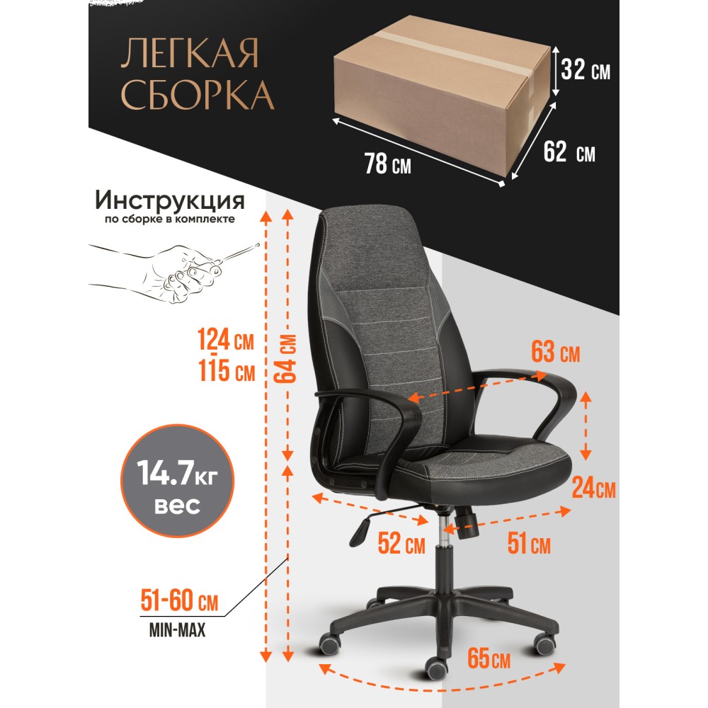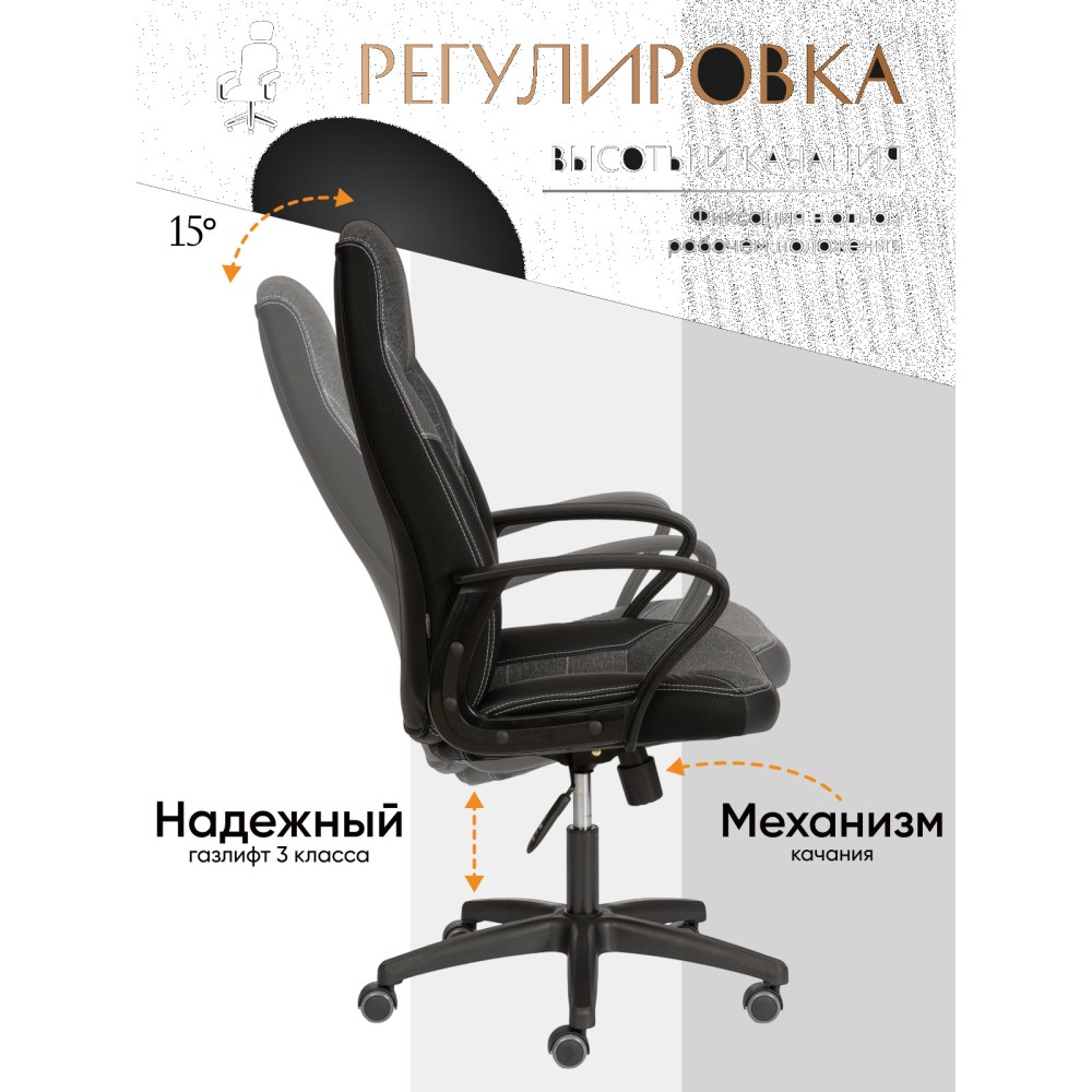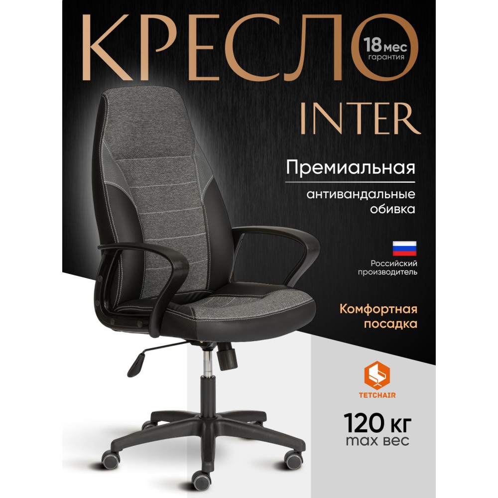 Уникальные черты компьютерного кресла INTER из коллекции OFFICE помогут довести интерьер вашего рабочего пространства до совершенства. Модель гармонично впишется в любое помещение, сочетая в себе функциональность и оригинальный внешний вид. Каркас из экологически безопасной фанеры толщиной более 10 мм гипоаллергенен и надежен. Широкое сиденье с мягким наполнителем из пенополиуретана (до 35 кг/м2) стандартной плотности легко подстраивается под контуры тела человека, обладает отличными эксплуатационными качествами. Высота и наклон с фиксацией в одном положении регулируется при помощи основательного механизма. Пластиковая крестовина с декоративными вставками и специальными насечками для предотвращения соскальзывания ног надежна, устойчива к частому использованию и усиленной эксплуатации. Полиуретановые ролики с прорезиненными вставками имеют тихий ход, подходят для использования на ламинате и паркете. Ролики и крестовина в креслах бренда TETCHAIR соответствуют стандарту BIFMA. Во всех креслах бренда TETCHAIR используются газлифты 3 класса, он способен выдерживать вес до 120 кг. Фиксированные пластиковые подлокотники с декоративными вставками снимут нагрузку с плеч и помогут расслабиться. Оригинальное сочетание высокопрочной износостойкой экокожи и крепкой ткани выглядит стильно и изысканно. Экокожа, используемая при изготовлении кресла, выдерживает до 50 000 циклов на истирание по Мартиндейлу, ткань флок также выдерживает до 50 000 циклов. Ткани с прочностью более 35 000 циклов являются самыми долговечными. Мебель, в которой используются такие ткани можно использовать не только дома но и в ресторанах, салонах красоты, приемных. Привлекательная модель INTER представлена в коричневом, черном и сером цветах. Офисное кресло произведет впечатление на вас своей солидностью, долговечностью и отличными эксплуатационными качествами. Модель поставляется в разобранном виде. Необходима простая сборка по прилагаемой инструкции. Максимальная нагрузка 120 кг.