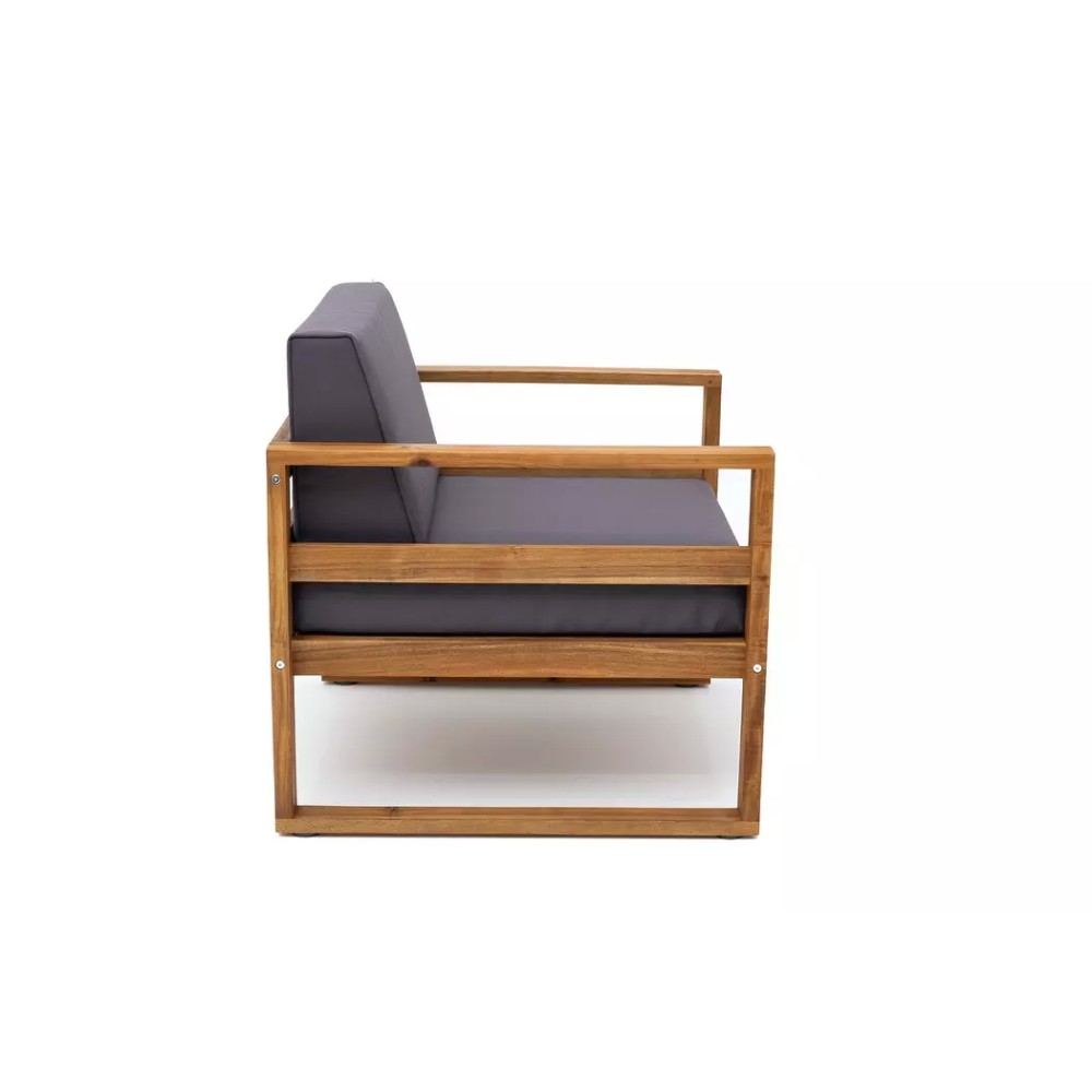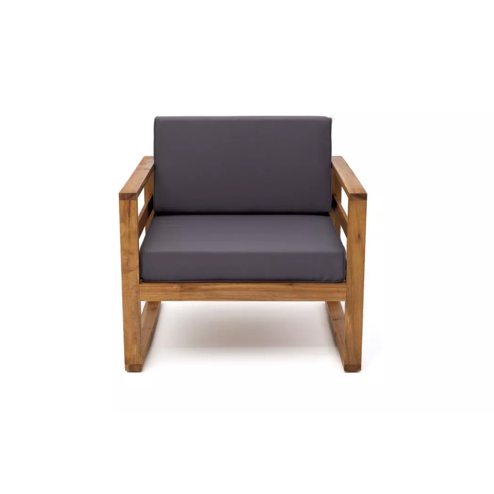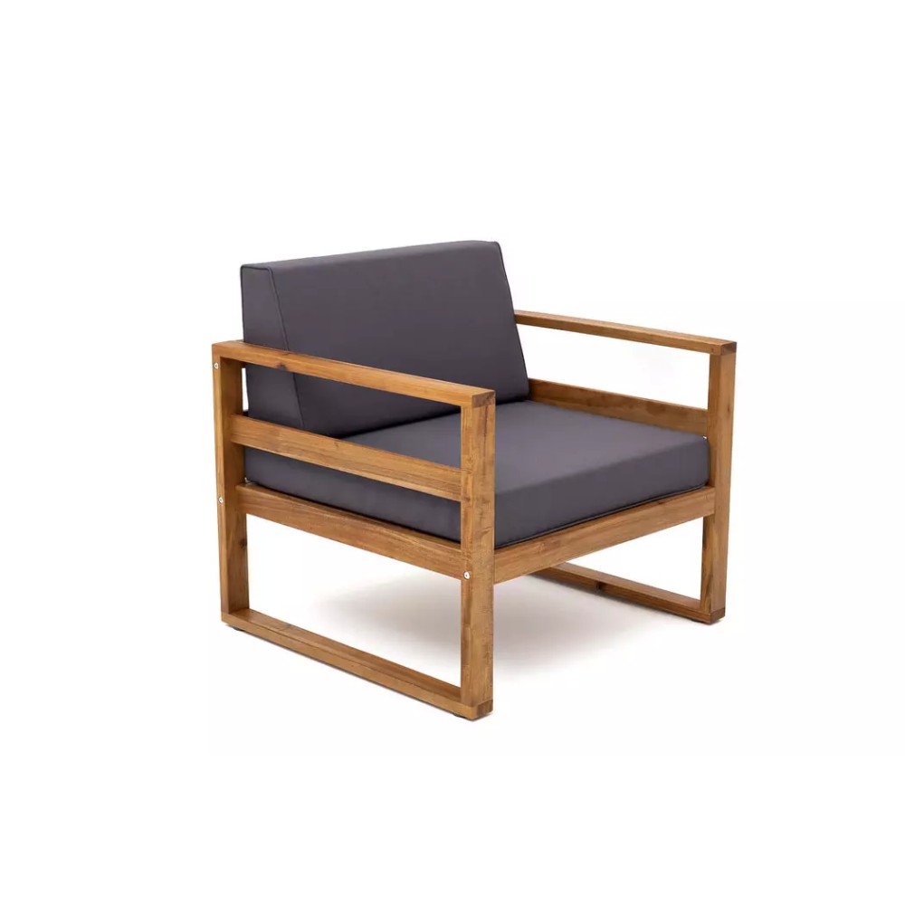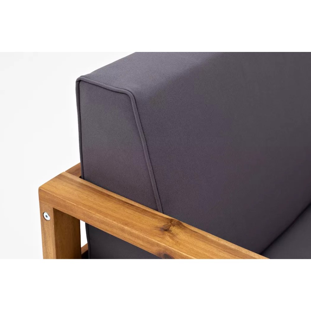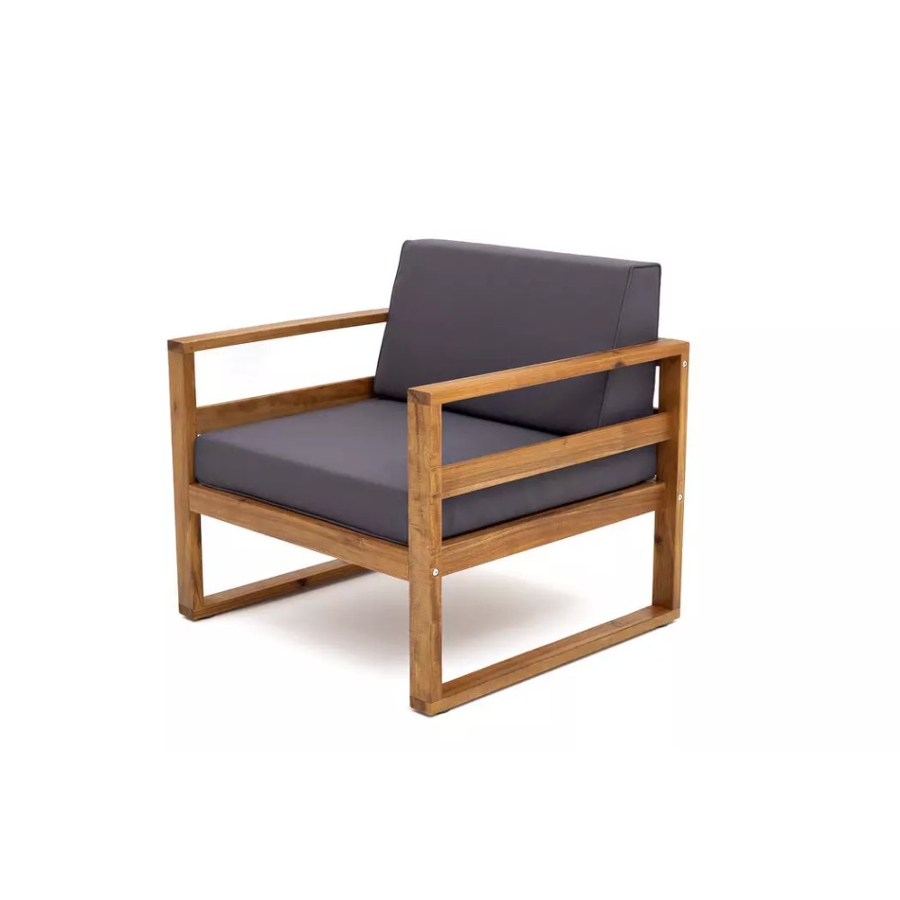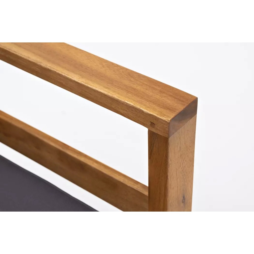 Коллекция БУКА. Материал — массив акации, отделка экомаслом под натуральный тик. Анодированная фурнитура из нержавеющей стали. Подушки в комплекте, ткань подушек – Олефин, цвет подушек темно-серый графит.