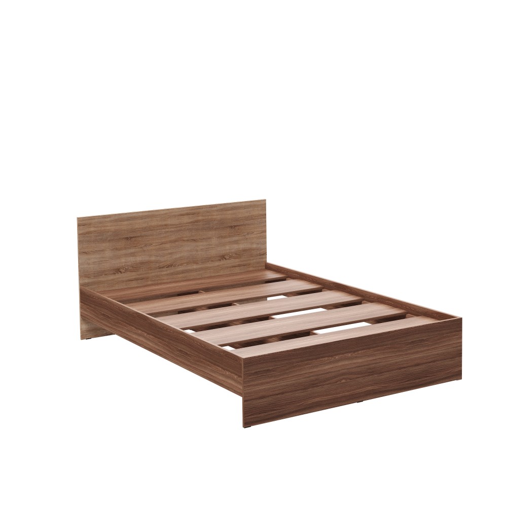 Выразительное высокое изголовье служит не только декоративным элементом, но и обеспечивает удобную поддержку во время чтения или отдыха. Конструкция основания включает прочные ЛДСП-ламели, надёжно закреплённые в каркасе. Они обеспечивают стабильную опору для матраса, способствуют правильному распределению нагрузки и поддерживают естественную вентиляцию, что делает спальное место практичным и комфортным для ежедневного использования.