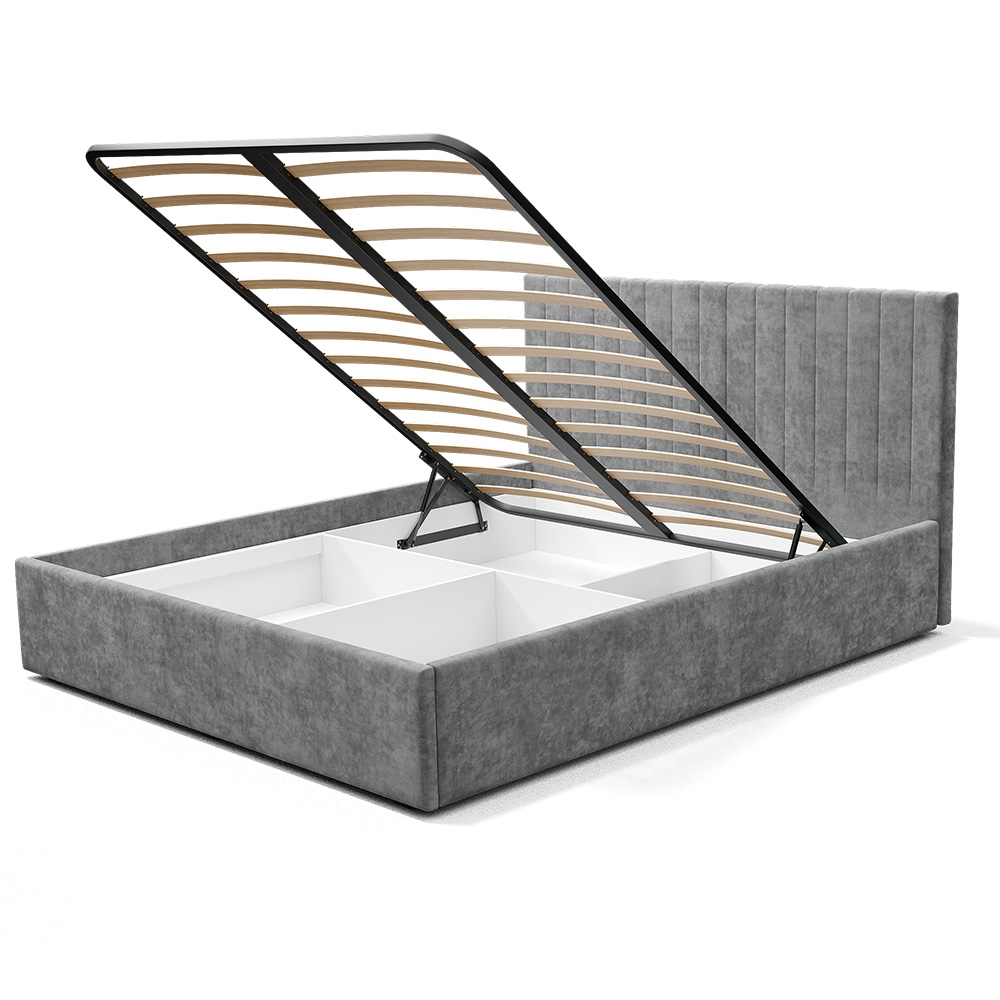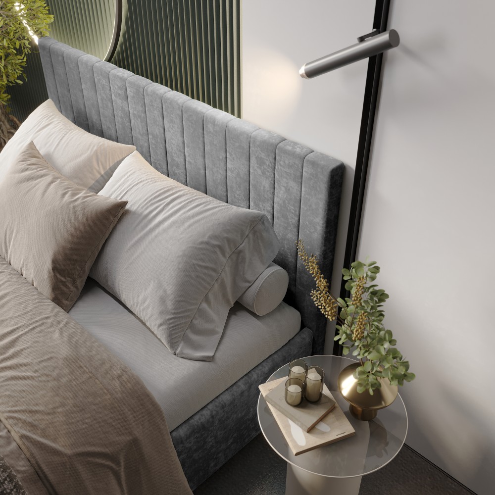 — Материал мягких частей (изголовье, царги, изножье) - велюр, поролон; задняя сторона - спанбонд серый. Поролон: мягкое изголовье - 20 мм, изножье - 30 мм, царги - 20 мм. Декор изголовья - стежка.