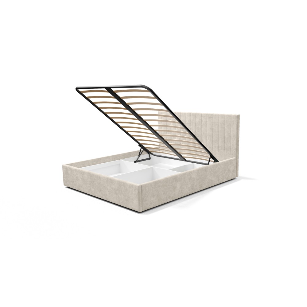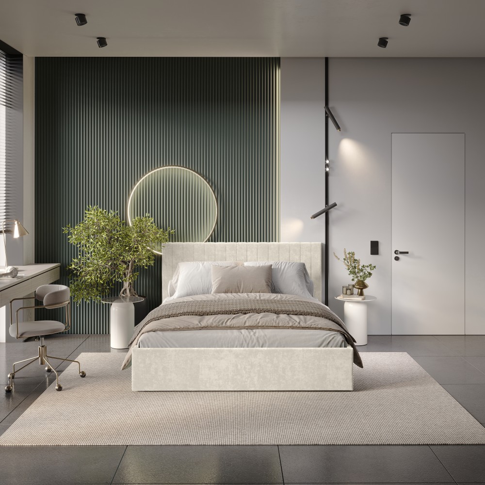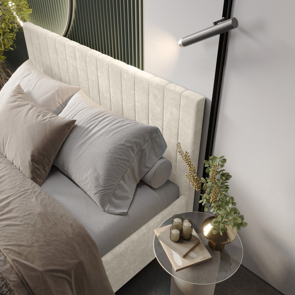 — Материал мягких частей (изголовье, царги, изножье) - велюр, поролон; задняя сторона - спанбонд серый. Поролон: мягкое изголовье - 20 мм, изножье - 30 мм, царги - 20 мм. Декор изголовья - стежка.
