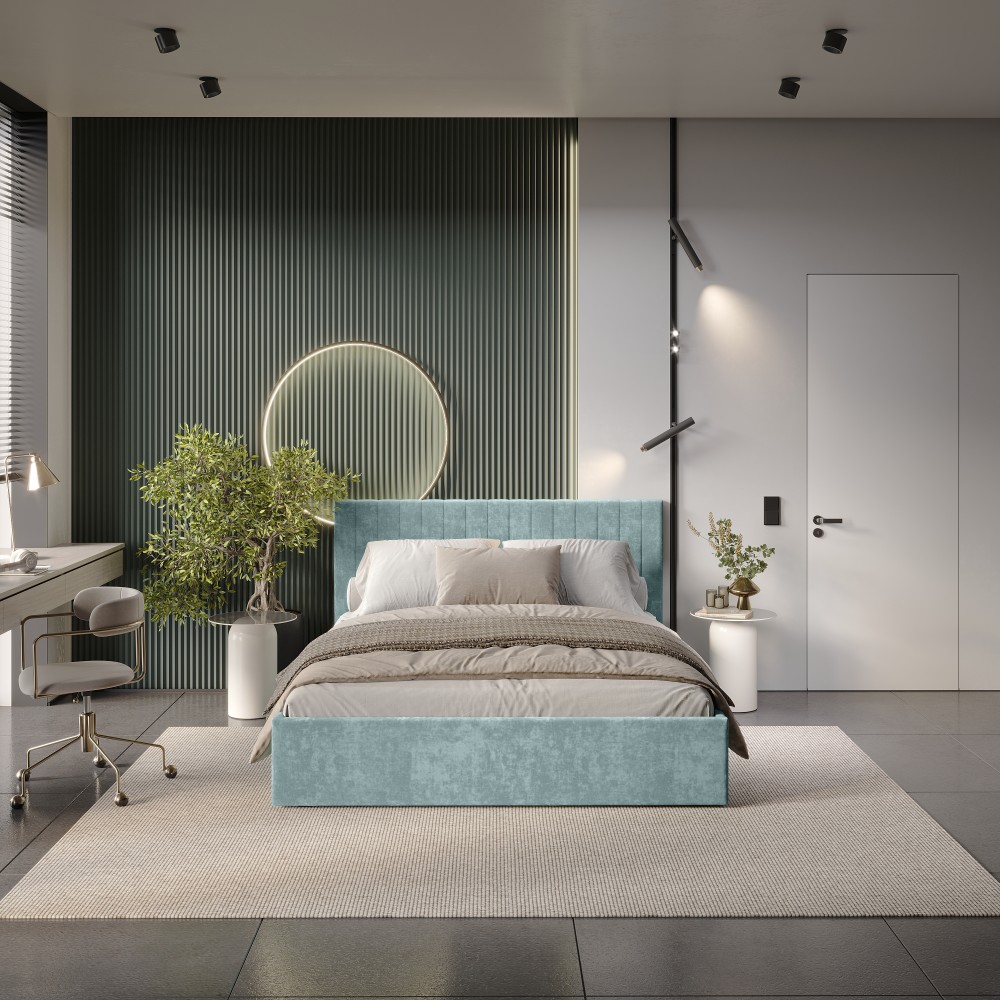 — Материал мягких частей (изголовье, царги, изножье) - велюр, поролон; задняя сторона - спанбонд серый. Поролон: мягкое изголовье - 20 мм, изножье - 30 мм, царги - 20 мм. Декор изголовья - стежка.