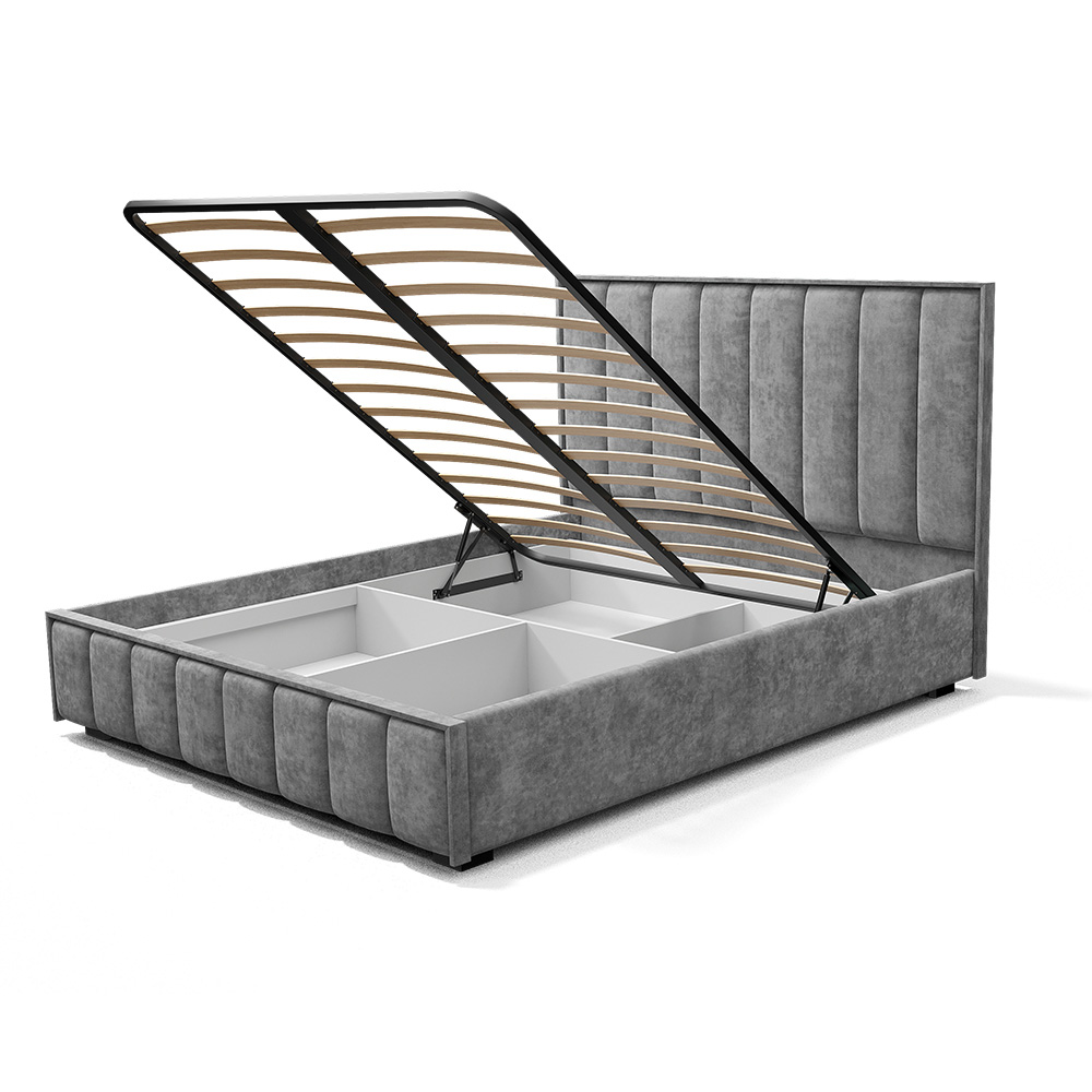 Изголовье, царги и изножье - это мягкие части кровати. Изголовье и изножье оформлены мягкими накладками, расцветка соответвует варианту исполнения. Ткань обивки - велюр.