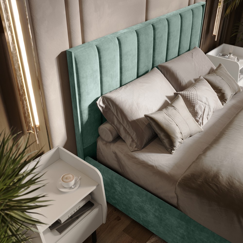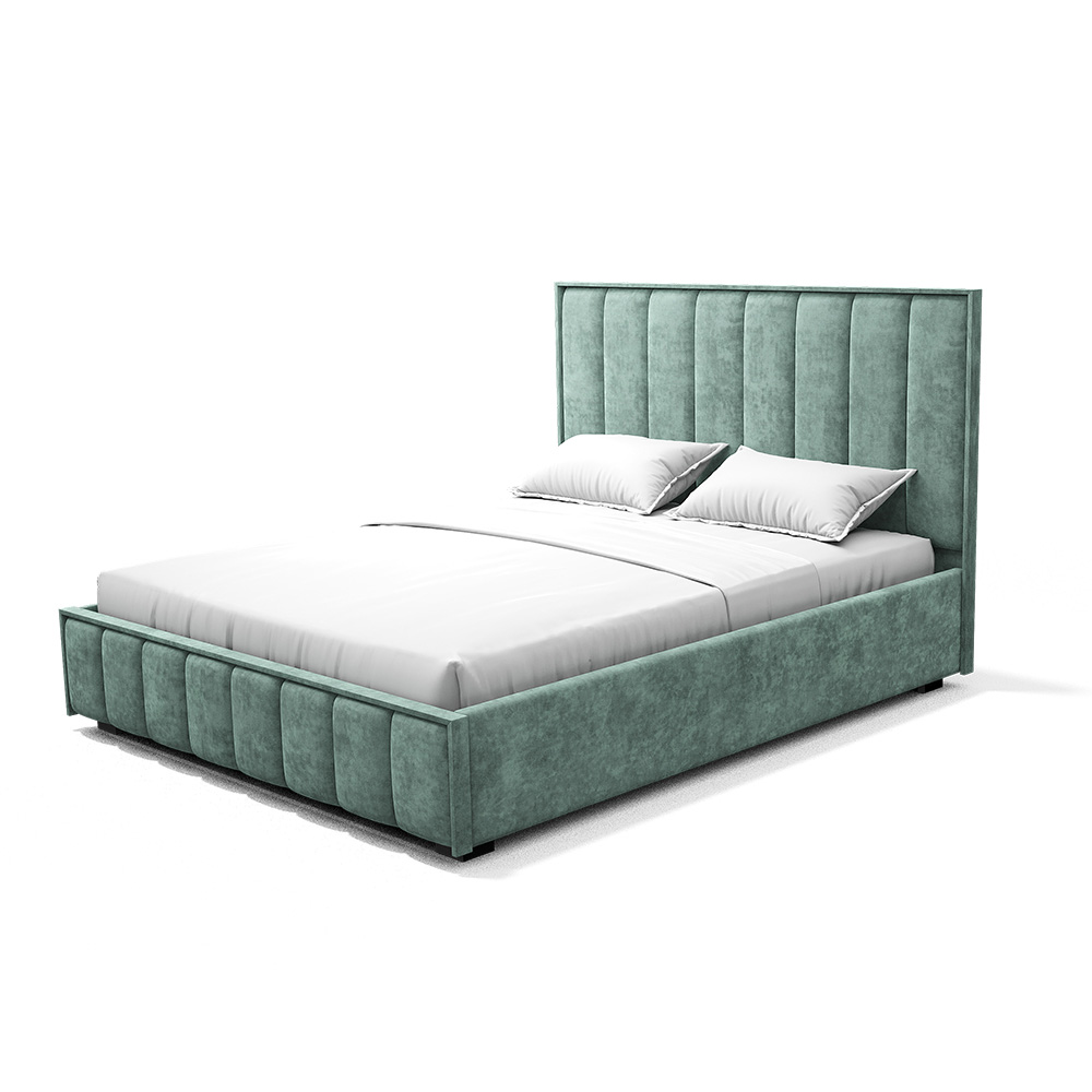 Изголовье, царги и изножье - это мягкие части кровати. Изголовье и изножье оформлены мягкими накладками, расцветка соответвует варианту исполнения. Ткань обивки - велюр.