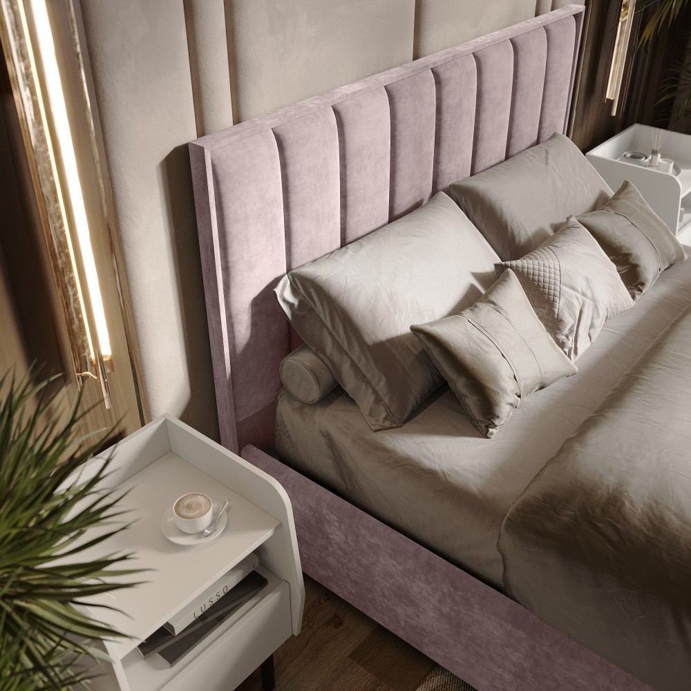 Изголовье, царги и изножье - это мягкие части кровати. Изголовье и изножье оформлены мягкими накладками, расцветка соответвует варианту исполнения. Ткань обивки - велюр.