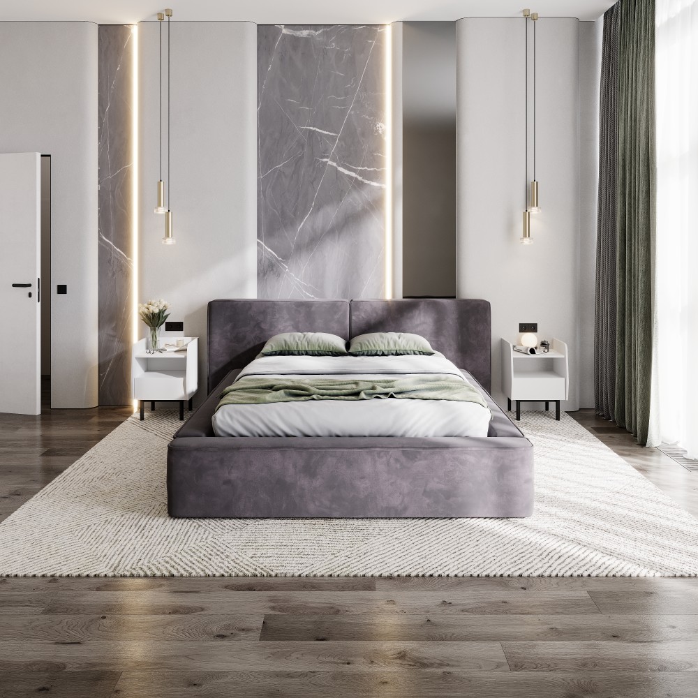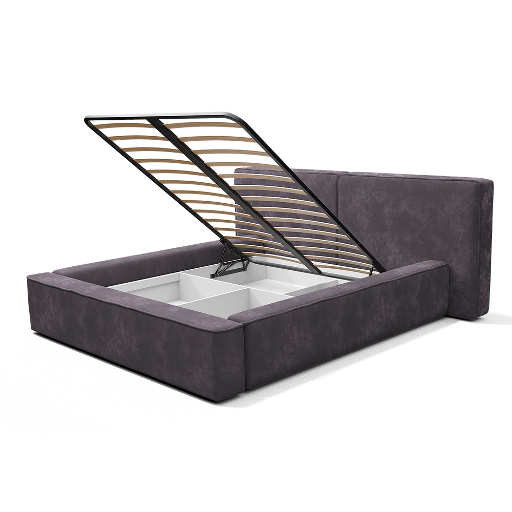 Материал мягких частей - велюр, искусственная замша. Декор изголовья и изножья - элегантный кант.