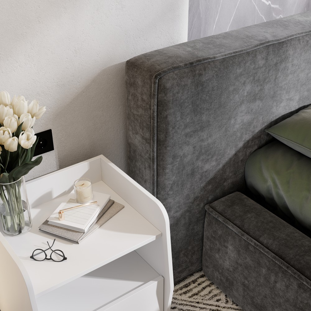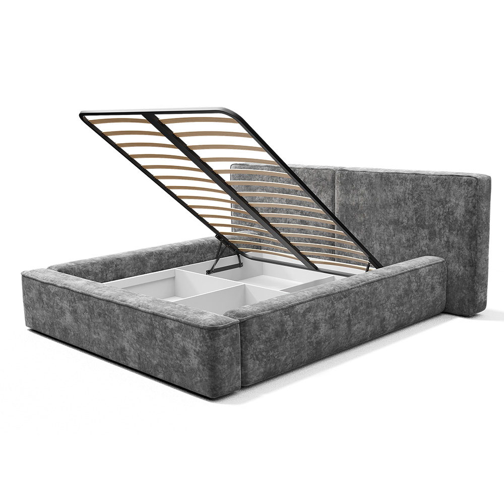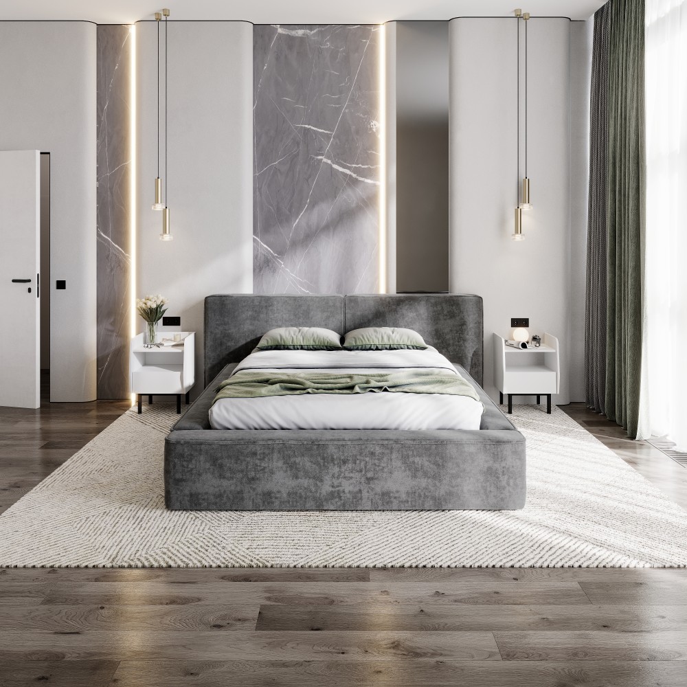 Материал мягких частей - велюр, искусственная замша. Декор изголовья и изножья - элегантный кант.
