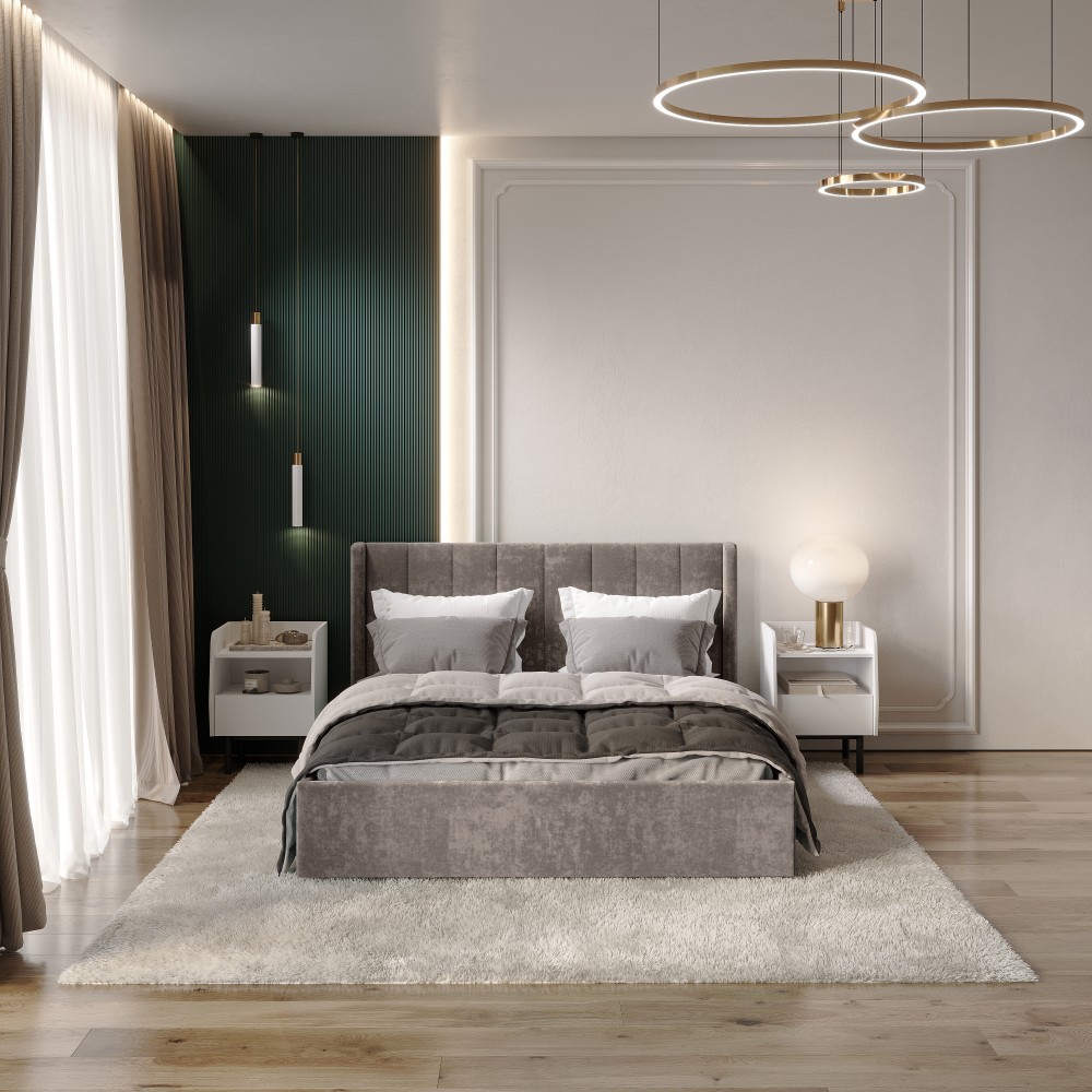 — Материал мягких частей - велюр, задняя сторона - спанбонд серый. Декор изголовья - стежка.