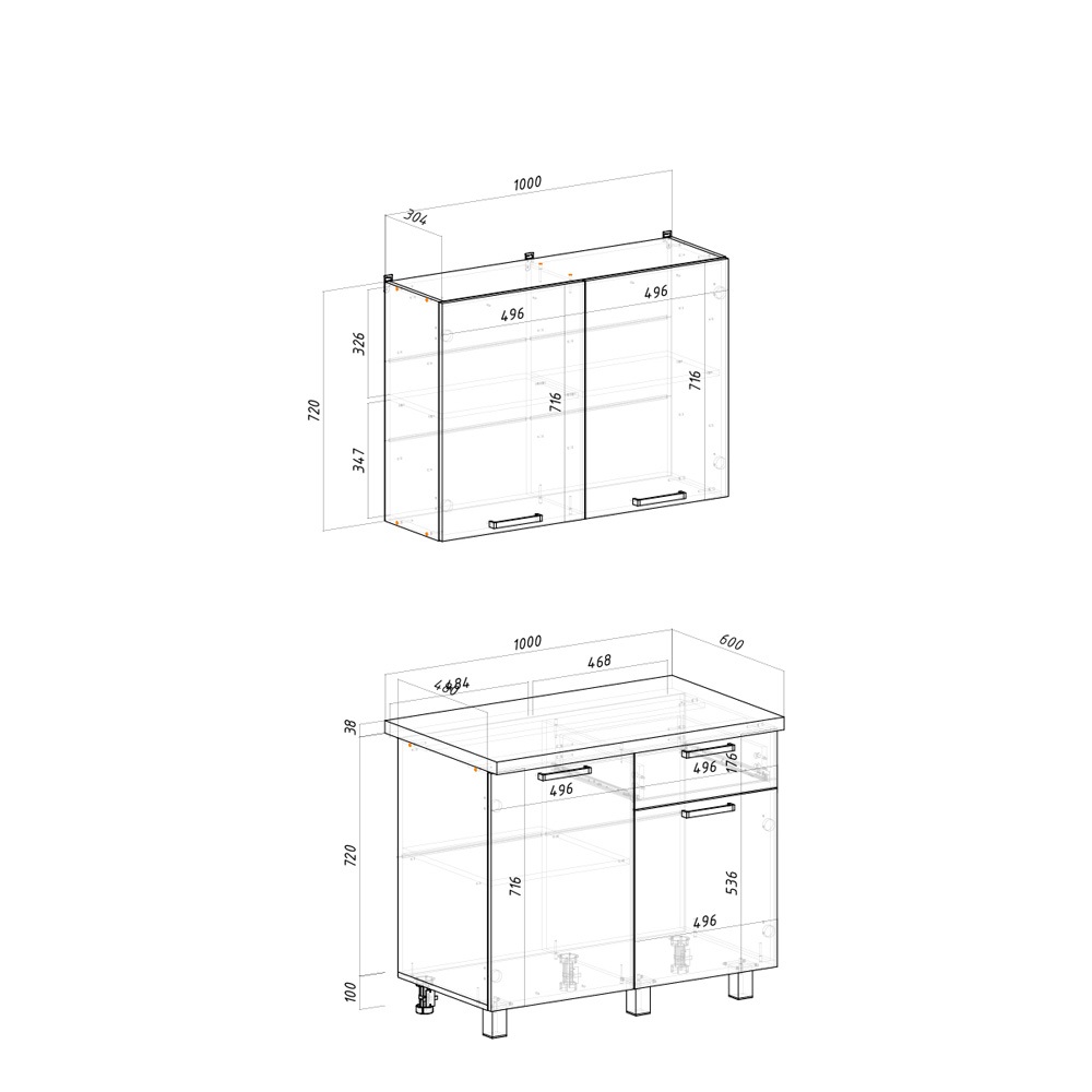 - Нижний модуль: 1ОР2, высота - 858 мм (без опор), глубина - 600 мм.