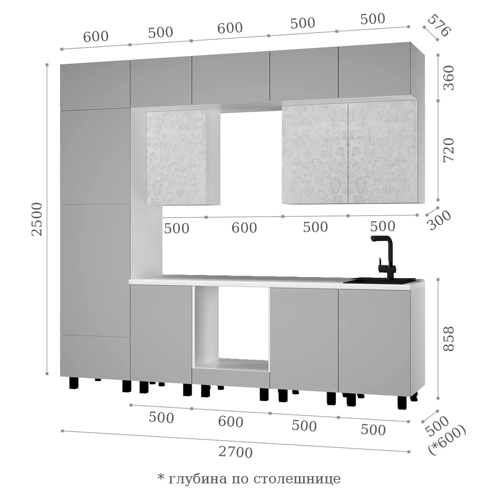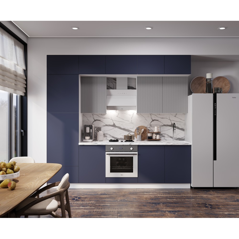 Фактурная кухня с благородной текстурой декоративной штукатурки. В комплекте: массивная столешница 38 мм в цвете «белый мрамор», система push to open для открытия легким нажатием, шариковые направляющие – тихий бонус к безупречной функциональности. Газлифт обеспечивает плавное открытие дверок, петли с доводчиками. Дополнительно можно приобрести цоколь для нижних модулей.