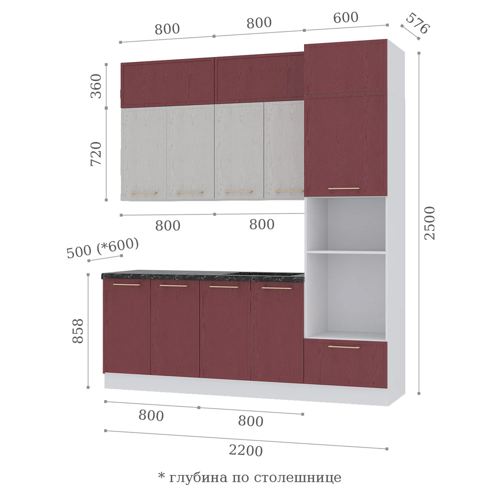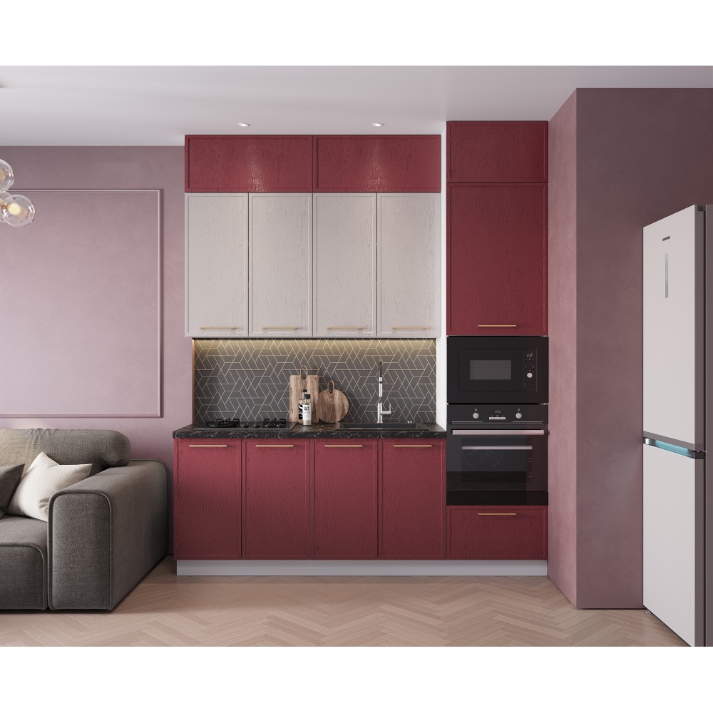 Кухня 1,8 м — стильное и выразительное решение для современных интерьеров. Контрастное сочетание глубокого бордового цвета с светлыми молочными фасадами делает гарнитур акцентным элементом пространства, сохраняя при этом визуальный баланс и уют.