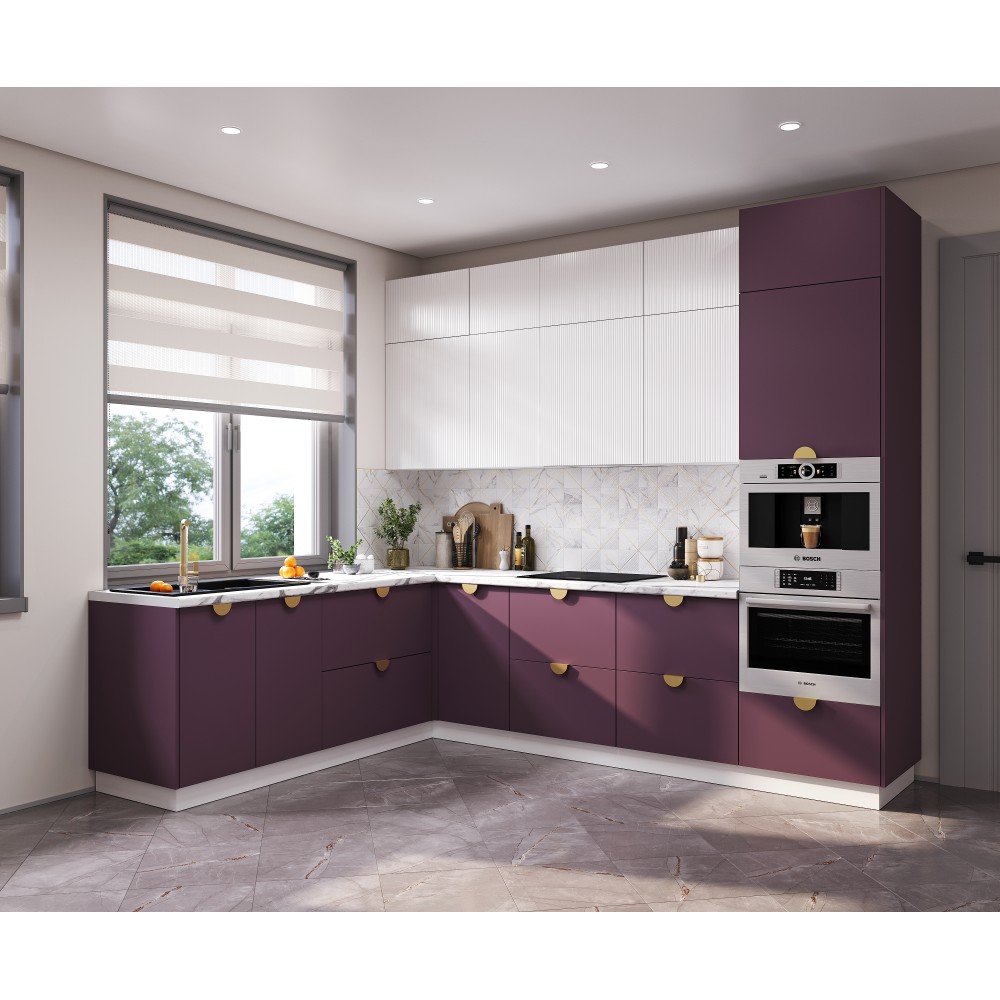 Модульная кухня с вертикальным рельефом верхних. В комплекте: массивная столешница 38 мм в цвете «черный янтарь», система push to open для открытия легким нажатием, шариковые направляющие – тихий бонус к безупречной функциональности. Газлифт обеспечивает плавное открытие дверок, петли с доводчиками. Дополнительно можно приобрести цоколь для нижних модулей.
