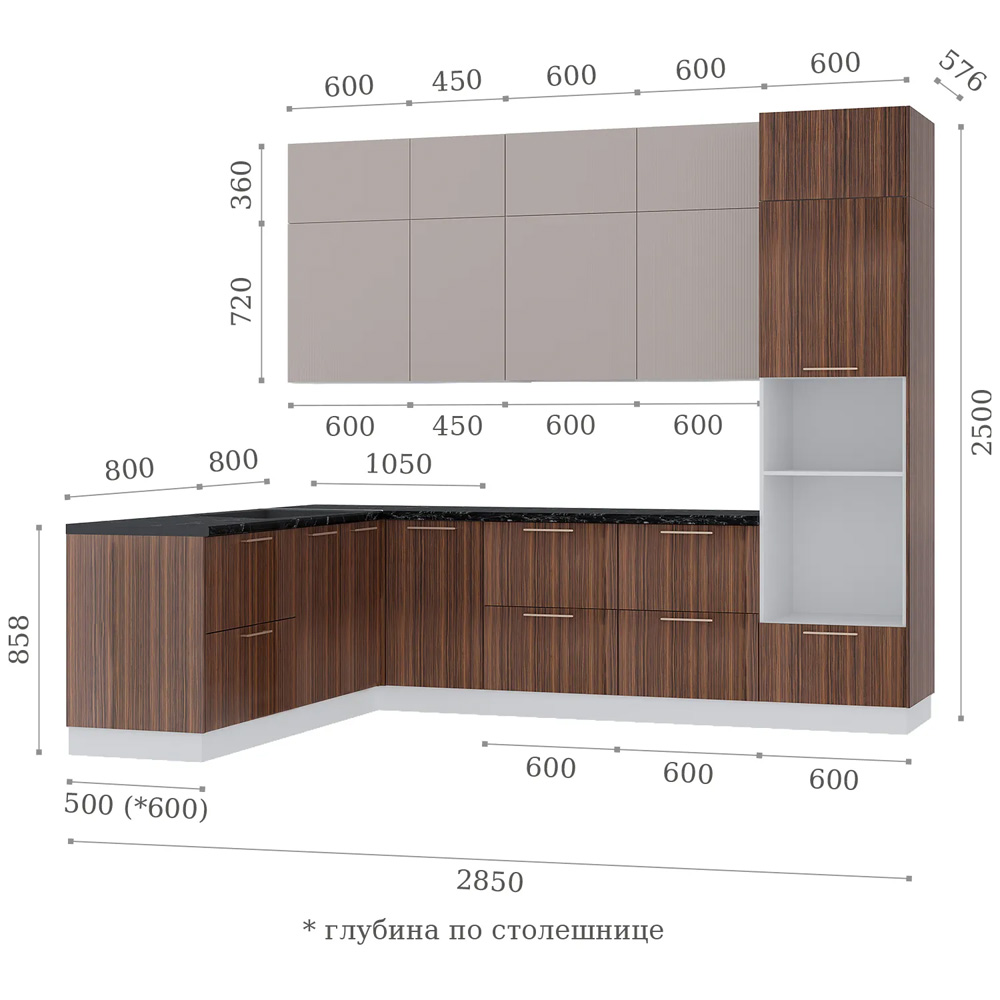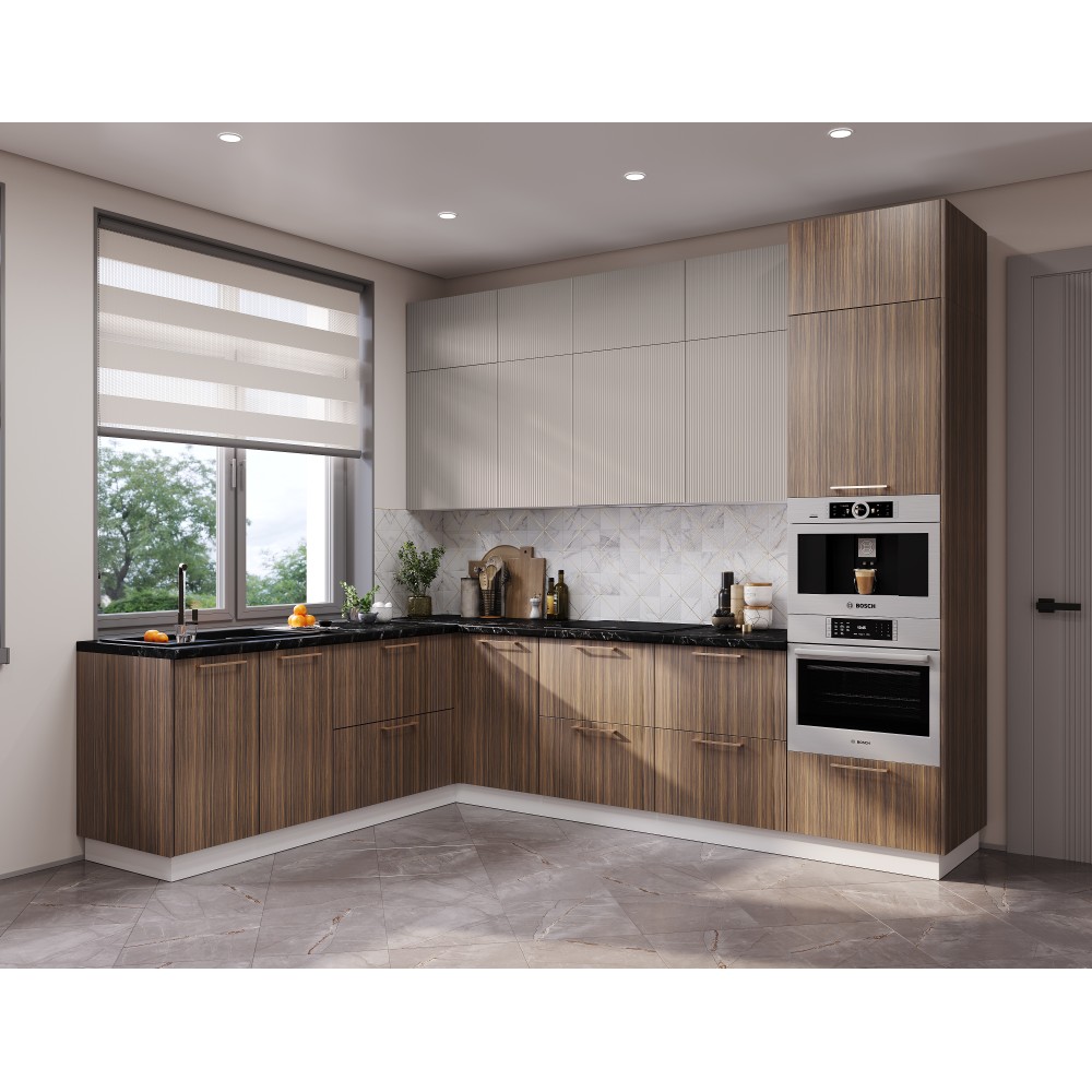 Модульная кухня с вертикальным рельефом верхних. В комплекте: массивная столешница 38 мм в цвете «черный янтарь», система push to open для открытия легким нажатием, шариковые направляющие – тихий бонус к безупречной функциональности. Газлифт обеспечивает плавное открытие дверок, петли с доводчиками. Дополнительно можно приобрести цоколь для нижних модулей.