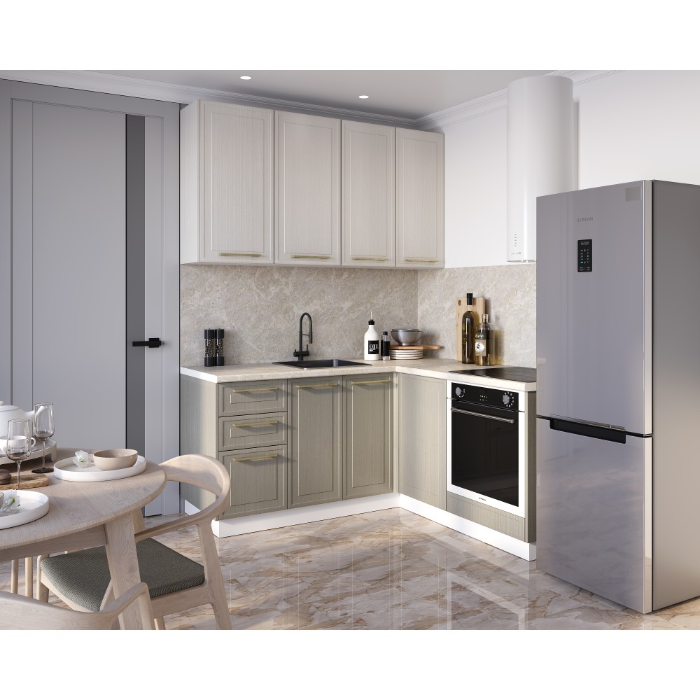 В комплекте: массивная столешница 38 мм, система push to open для открытия легким нажатием, шариковые направляющие – тихий бонус к безупречной функциональности. Газлифт обеспечивает плавное открытие дверок, петли с доводчиками. Дополнительно можно приобрести цоколь для нижних модулей.