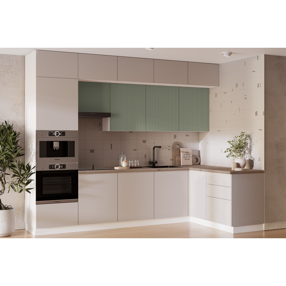 Угловая кухня в теплой природной палитре. В комплекте: массивная столешница 38 мм в цвете «дуб кера», система push to open для открытия легким нажатием, шариковые направляющие – тихий бонус к безупречной функциональности. Газлифт обеспечивает плавное открытие дверок, петли с доводчиками. Дополнительно можно приобрести цоколь для нижних модулей.