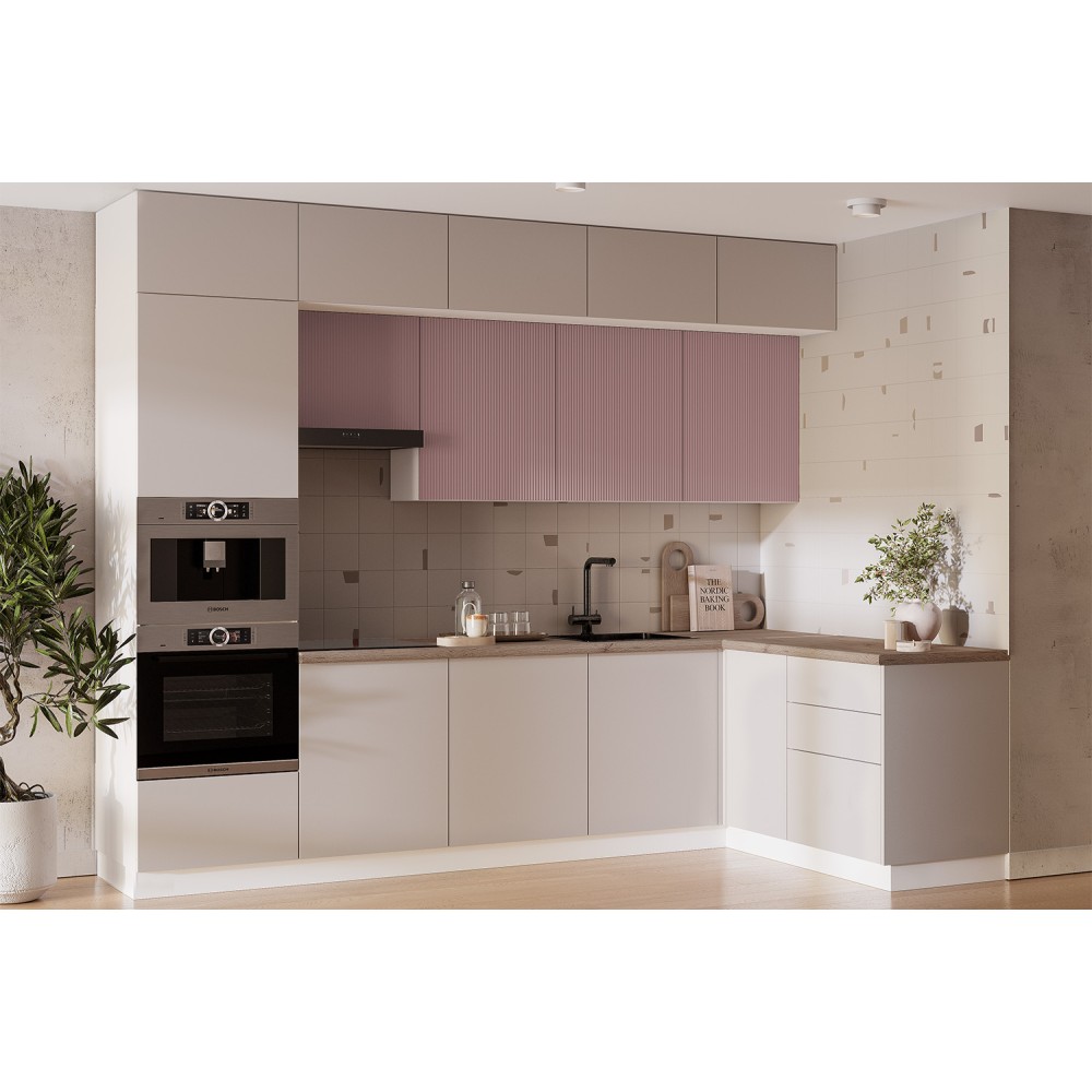 Угловая кухня в теплой природной палитре. В комплекте: массивная столешница 38 мм в цвете «дуб кера», система push to open для открытия легким нажатием, шариковые направляющие – тихий бонус к безупречной функциональности. Газлифт обеспечивает плавное открытие дверок, петли с доводчиками. Дополнительно можно приобрести цоколь для нижних модулей.