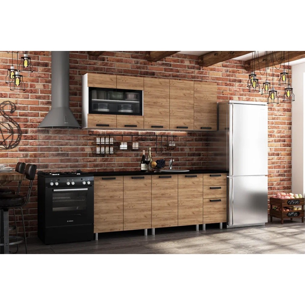 Кухня "Крафт" – отличный выбор для современного интерьера, особенно в стиле "лофт". Модель оснащена всеми необходимыми нишами и полками для комфортного размещения посуды и продуктов. Гарнитур выполнен из высококачественной ЛДСП с фасадами в цвете "крафт" и дополнен стильными черными ручками. Часть верхних шкафов имеют стеклянные вставки, что облегчает всю конструкцию.