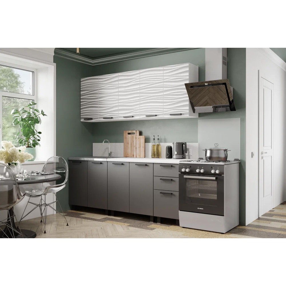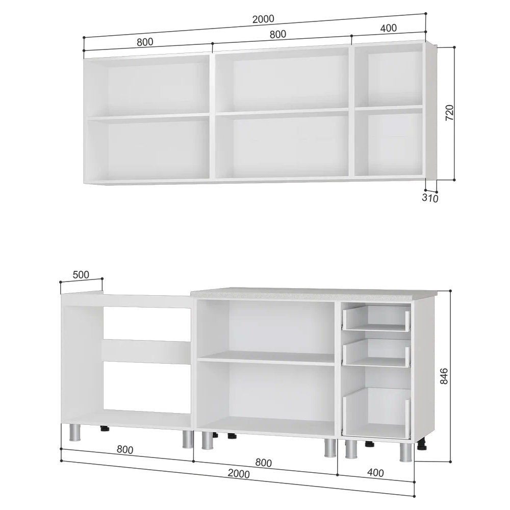 Габаритные размеры композиции нижних модулей с учётом столешницы: ширина: 2000 мм, высота: 846 мм, глубина: 600 мм. Габаритные размеры композиции верхних модулей: ширина: 2000 мм, высота: 720 мм, глубина: 304 мм.