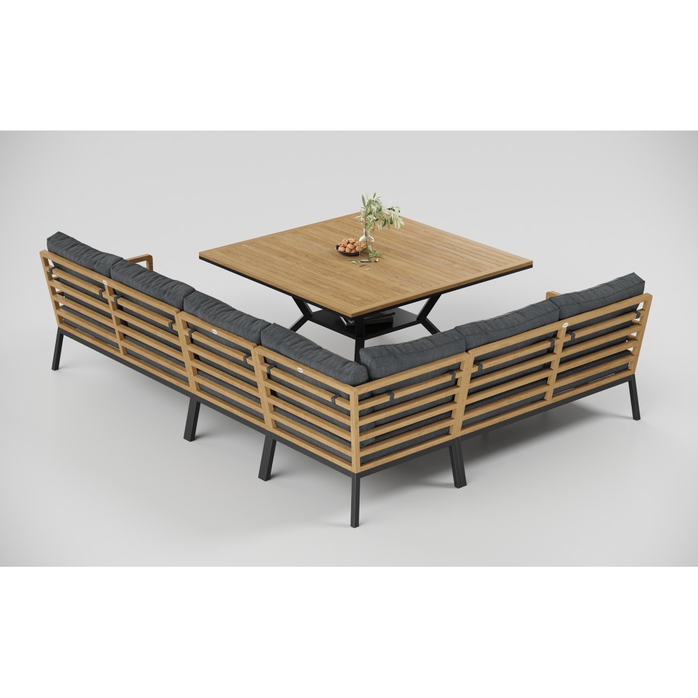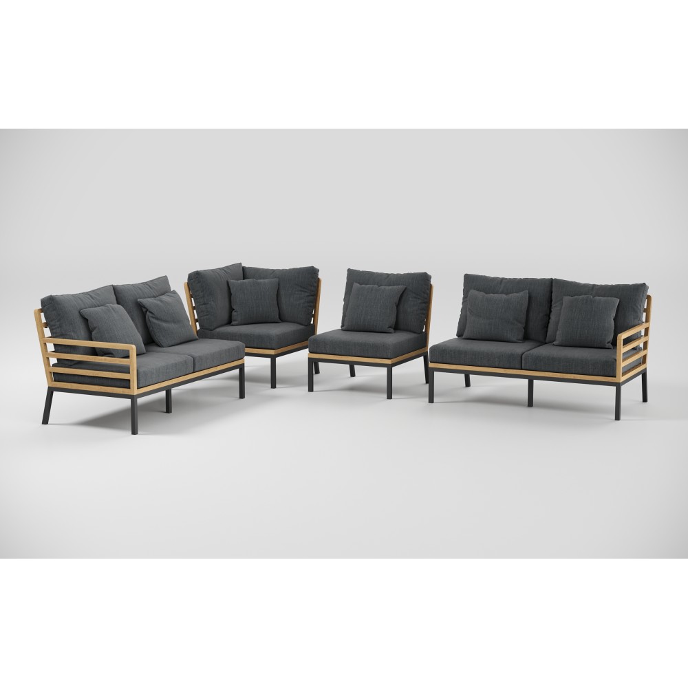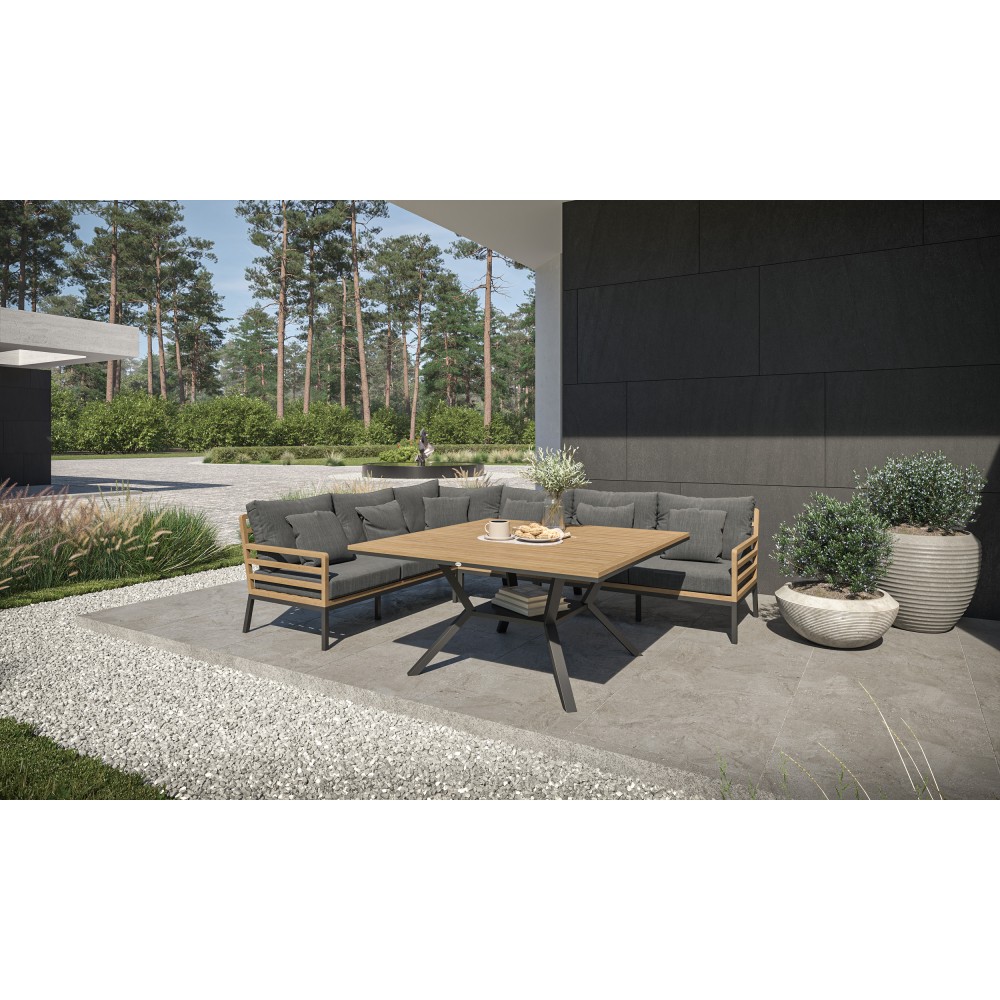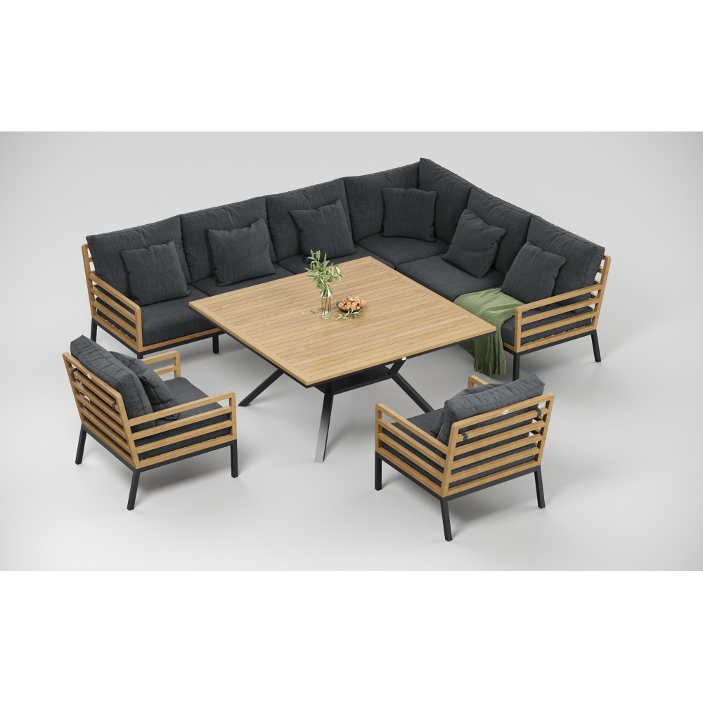 Особенности: каркас диванов из тика, подножье из алюминия, столешница стола из тиковых планок, премиальная уличная ткань, съемные чехлы подушек "на молнии", в комплекте 5 декоративных подушек