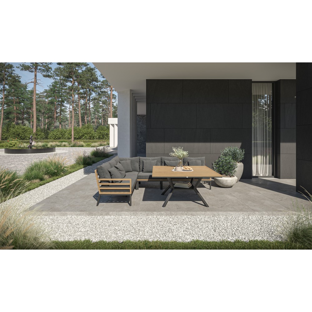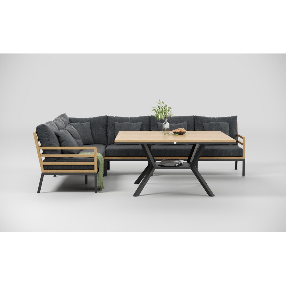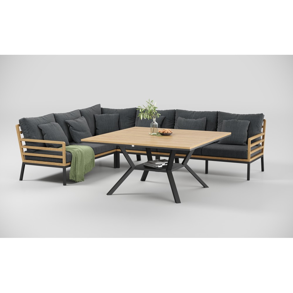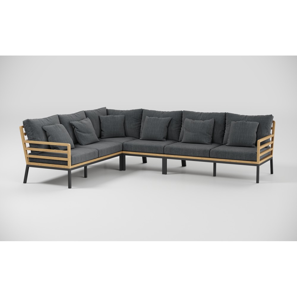 Особенности: каркас диванов из тика, подножье из алюминия, столешница стола из тиковых планок, премиальная уличная ткань, съемные чехлы подушек "на молнии", в комплекте 5 декоративных подушек