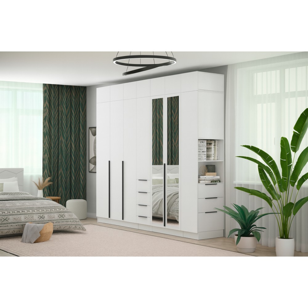 Гардеробная система Мадрид — это универсальное решение для спальни, гостиной и прихожей. Продуманное разноплановое наполнение позволит Вам разместить верхнюю одежду на плечиках на евроштанге, вещи в сложенном виде и аксессуары на полках.