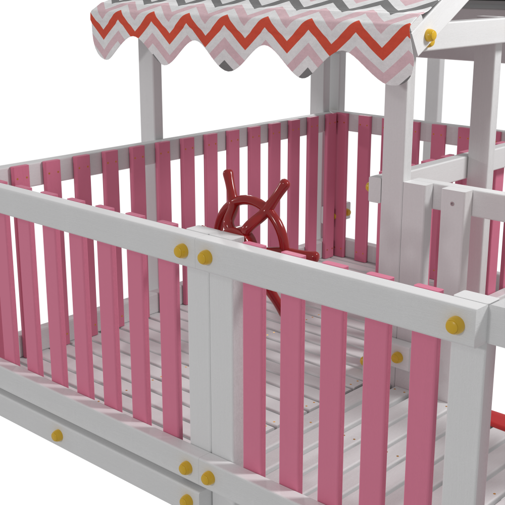 Игровой комплекс-кровать Капризун сделан из натурального дерева и рассчитан на детей в возрасте от 3 лет. В конструкции предусмотрены два спальных места, множество игровых элементов и спортивных снарядов.