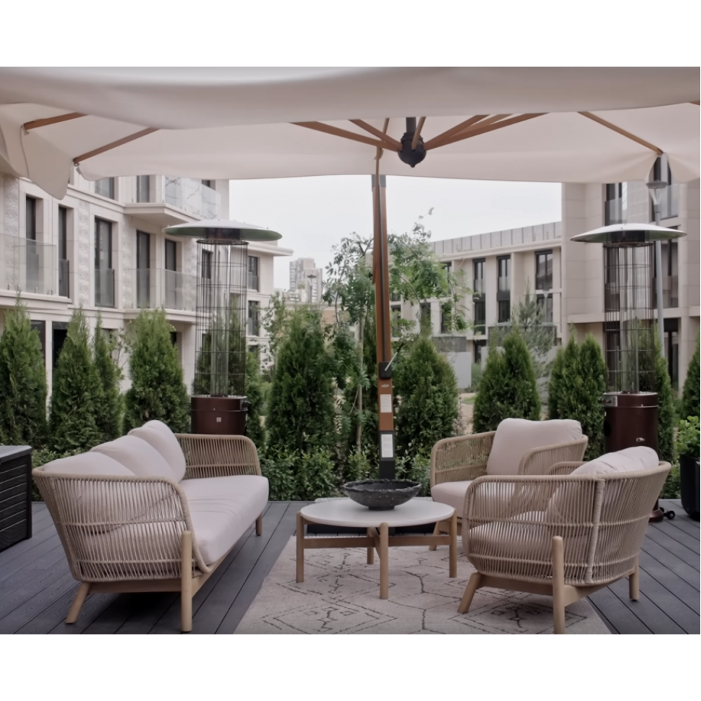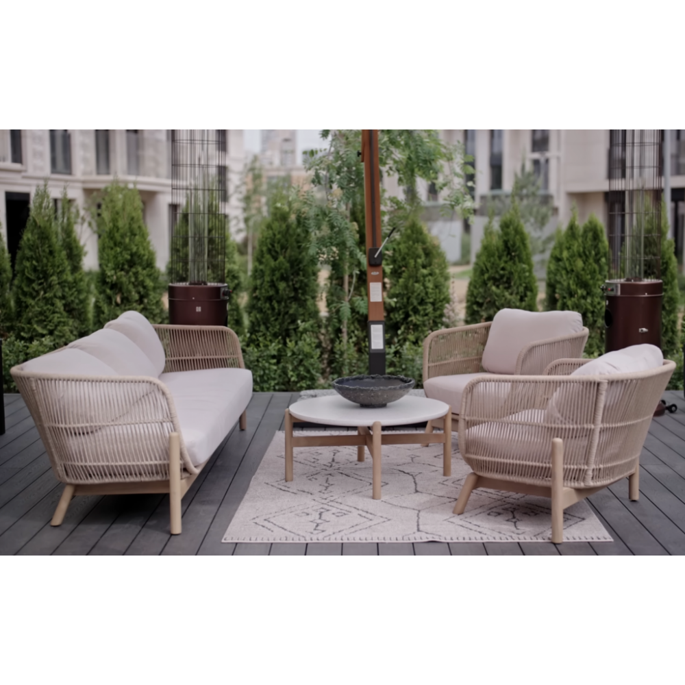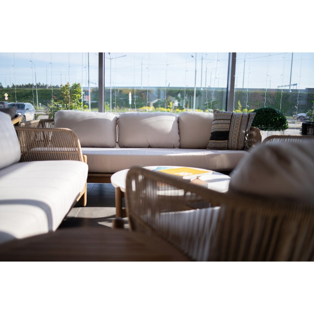 Крепкая алюминиевая рама оплетена синтетическим роупом. Обивка подушек выполнена из ткани олефин - прочного материала, устойчивого к воздействию грязи, влаги и УФ-лучей. Talara - это современная коллекция садовой мебели из акации, выполненная в комбинации натурального веревочного плетения роуп, акации и светлых подушек. Цвет натуральной твердой древесины представляет собой натуральный цвет с мелкой текстурой, придающий древесине приятный теплый вид. Особенности: Материал - АКАЦИЯ, отделка экомаслом тик Light #01A. Веревочное плетение роуп толщиной 6 мм на спинке и подлокотниках излучает стиль в сочетании с деревянными поверхностями. Цвет плетения: бежевый. Древесина, из которой изготовлена мебель, имеет сертификацию FSC (Forest Stewardship Council) - гарантия качества и происхождения древесины. Знак FSC - показатель того, что продукция происходит из леса, в котором ведется экологически и социально ответственное лесное хозяйство. Благодаря своей долговечности, прочности и устойчивости к вредителям эта древесина была создана для изготовления садовой мебели. Страна происхождения древесины: Вьетнам, Малайзия. Средняя плотность древесины: 550 кг/м3. Анодированная фурнитура из нержавеющей стали. Подушки в комплекте, ткань подушек - олефин, наполнитель - толстый поролон. Материалы устойчивы к УФ-излучению и другим погодным воздействиям. Цвет подушек: лен. Открыть инструкцию по уходу. Вся деревянная мебель должна обрабатываться специальным маслом или пропиткой минимум 1 раз в 6 месяцев (в условиях высокой влажности обработку следует проводить чаще). Для данной мебели не рекомендуются резкие температурные перепады. Мебель из дерева акации должна использоваться только под навесом. Дерево является натуральным материалом, поэтому любые трещины, неравномерные природные рисунки, различность оттенков ‐ являются естественным процессом, который вызван температурными изменениями или влажностью.