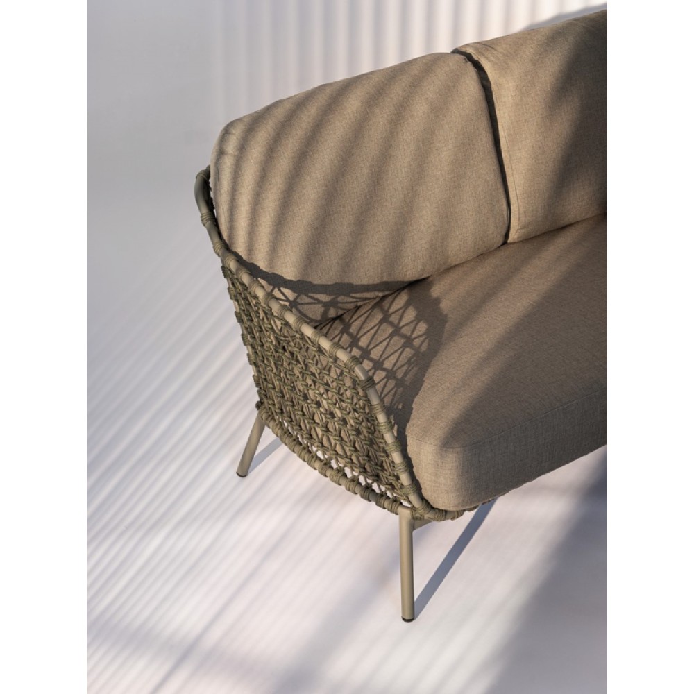 Минимальный заказ данной модели 1шт. Данное изделие предназначено только для домашнего использования. ДиванIvissa -это современный предмет мебели интереснойформы и цвета, благодаря которому он оживит любое пространство, в котором находится. Диван привлекает внимание и станет прекрасным дополнением гостиной зоны на открытом пространстве. Онизготовлениз стали и имеет мягкие подушки на сиденье и спинке.Подлокотники и продуманная конструкция гарантируют комфорт во время использования. Плетеный корпуспридает дивану удивительный характер. Ножки обеспечивают хорошую устойчивость. Особенности: Каркасвыполнен из нержавеющей стали AISI 201. Плетение для наружного использования выполнено из веревки (полипропилен). Съемные подушки из водоотталкивающей, устойчивой к солнцу олефиновой ткани (100% полипропилен). Для уточнения всех возможных вариантов материала и цвета данного изделия обращайтесь к нашим менеджерам.